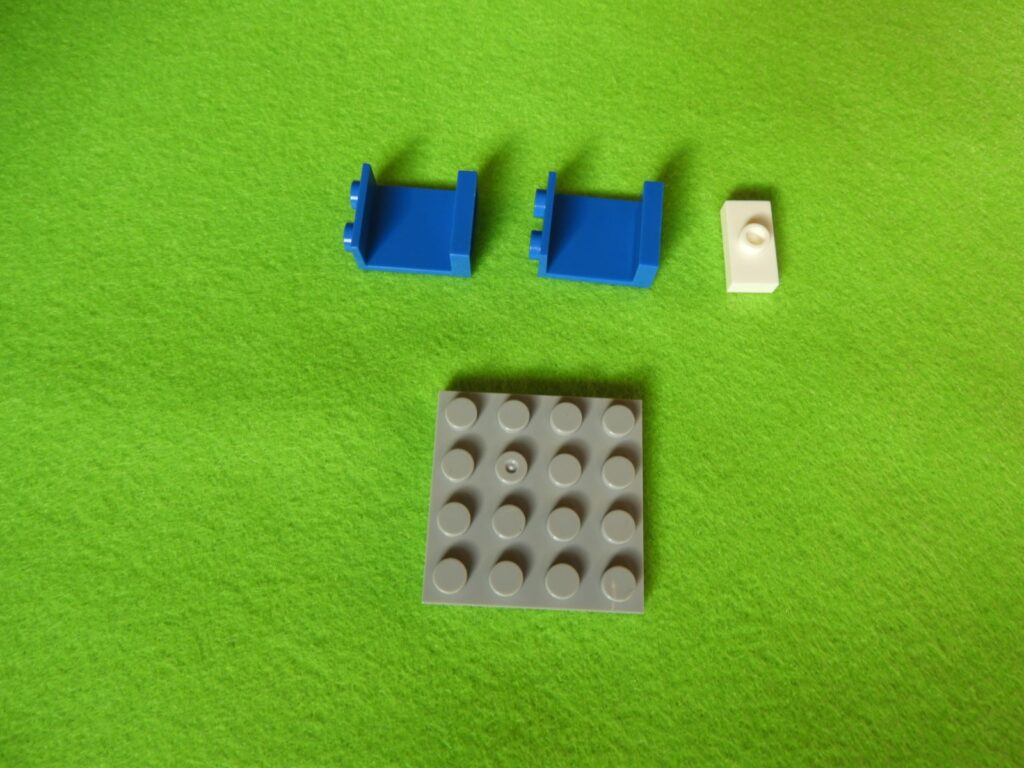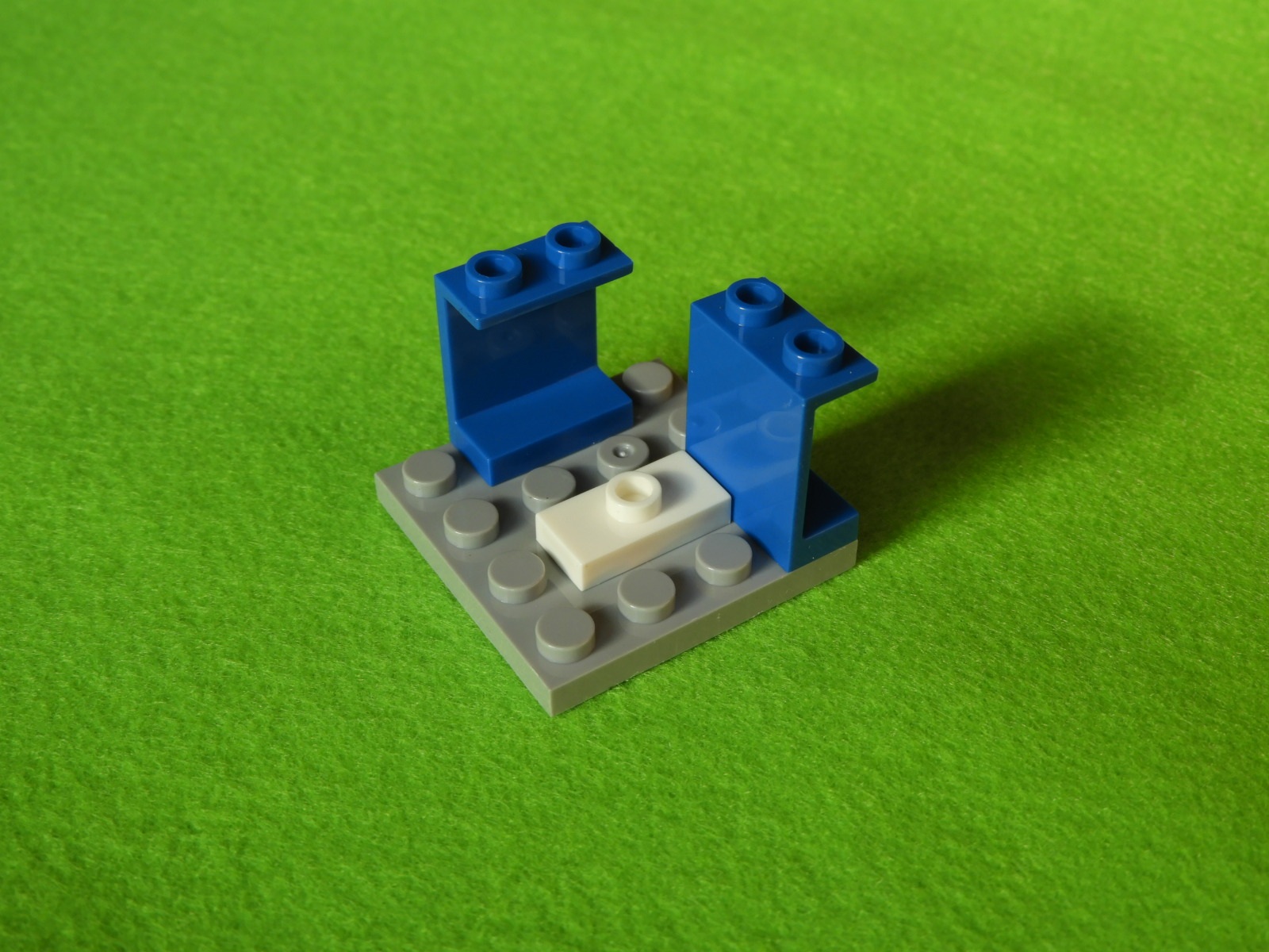 工程1番で使用するブロックを用意します。1.青ブロック2個と白ブロックを下記写真のようにグレーの板に取り付けます。これで工程1番は出来上がりました。