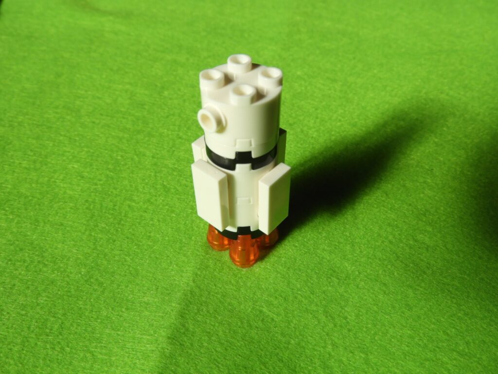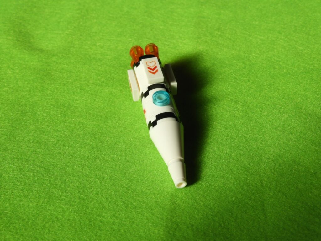 1.宇宙船の先端に、用意したブロック2個を取り付けます。最後に、付属のシールを貼り付けると宇宙船の完成です。
