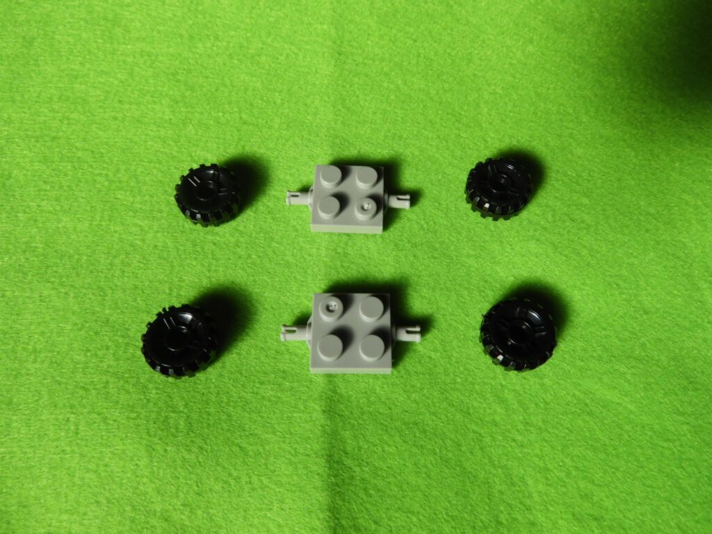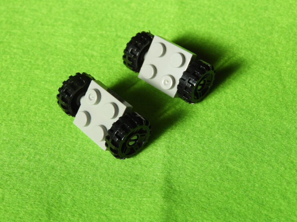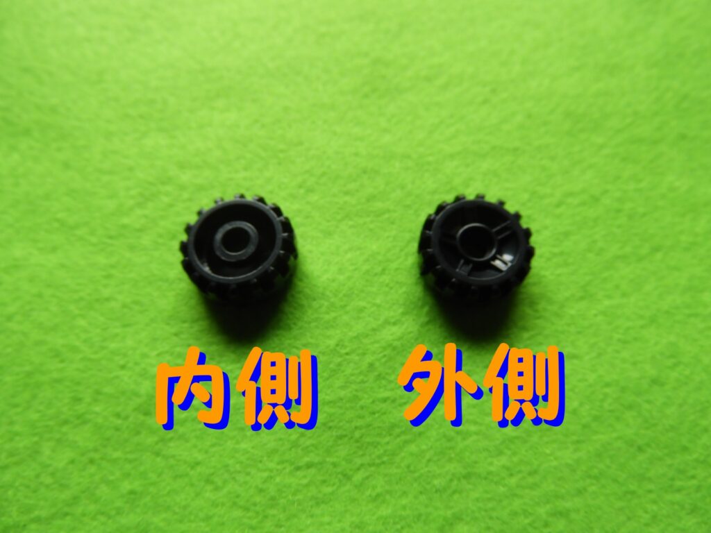 1.グレーのブロックにタイヤを取り付けます。タイヤには内側と外側があるのでよく確認してくださいね。