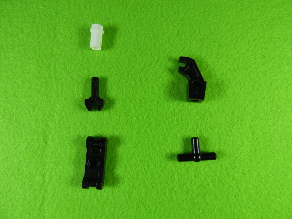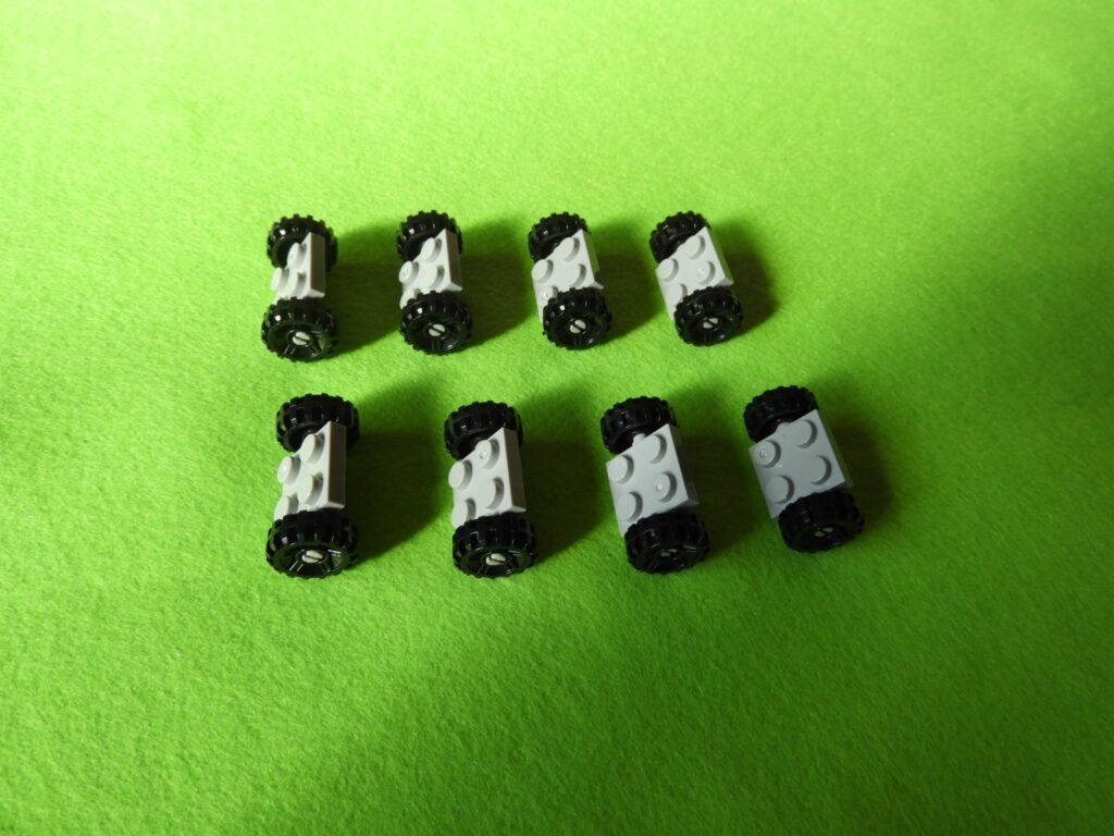 タイヤがついている車両から下記のパーツを取り出せばOKです。タイヤのパーツは8セットあります。これで工程1番は完了。※外しにくい場合は、一度タイヤを外してからグレーブロックを取り外すとやりやすいと思います。