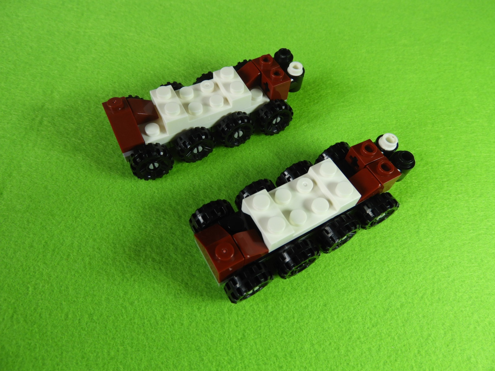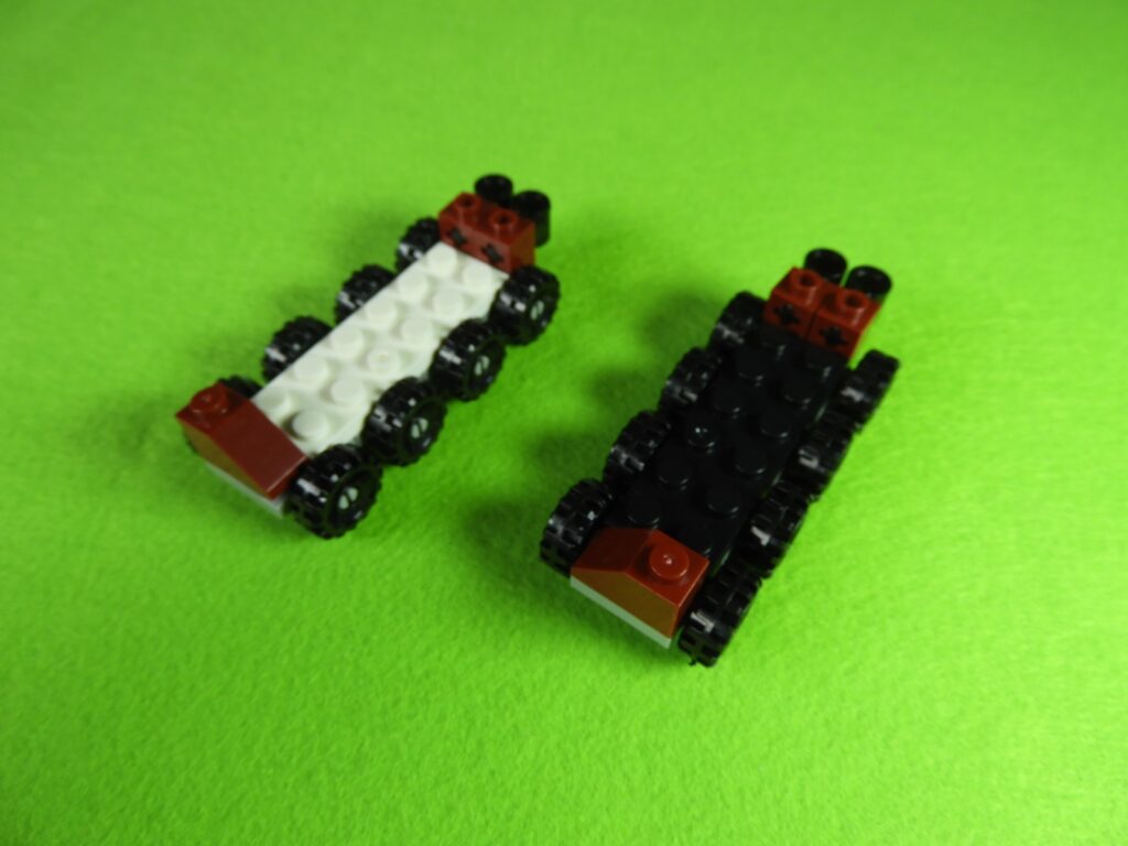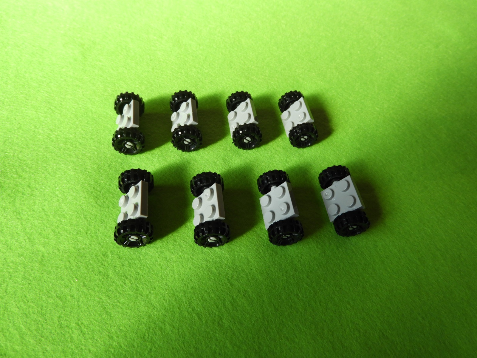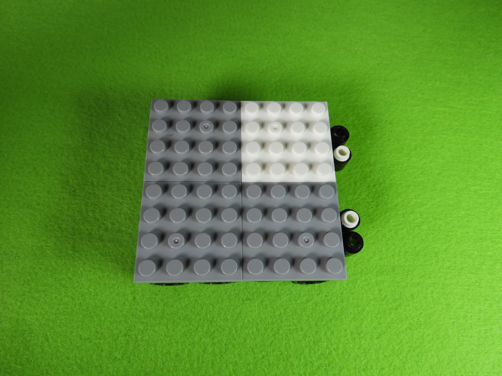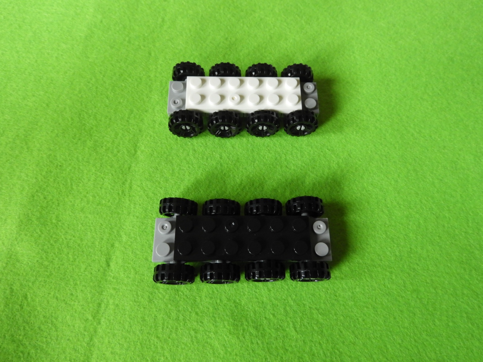 1.工程1番で組み立てた車輪を、白と黒長方形ブロックの下に取り付けます。