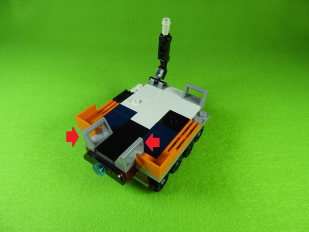 4.組み立てたブロックを車体の後方に取り付け、前方にグレーのブロック(赤矢印)2個を取り付けると工程7番は完成します。