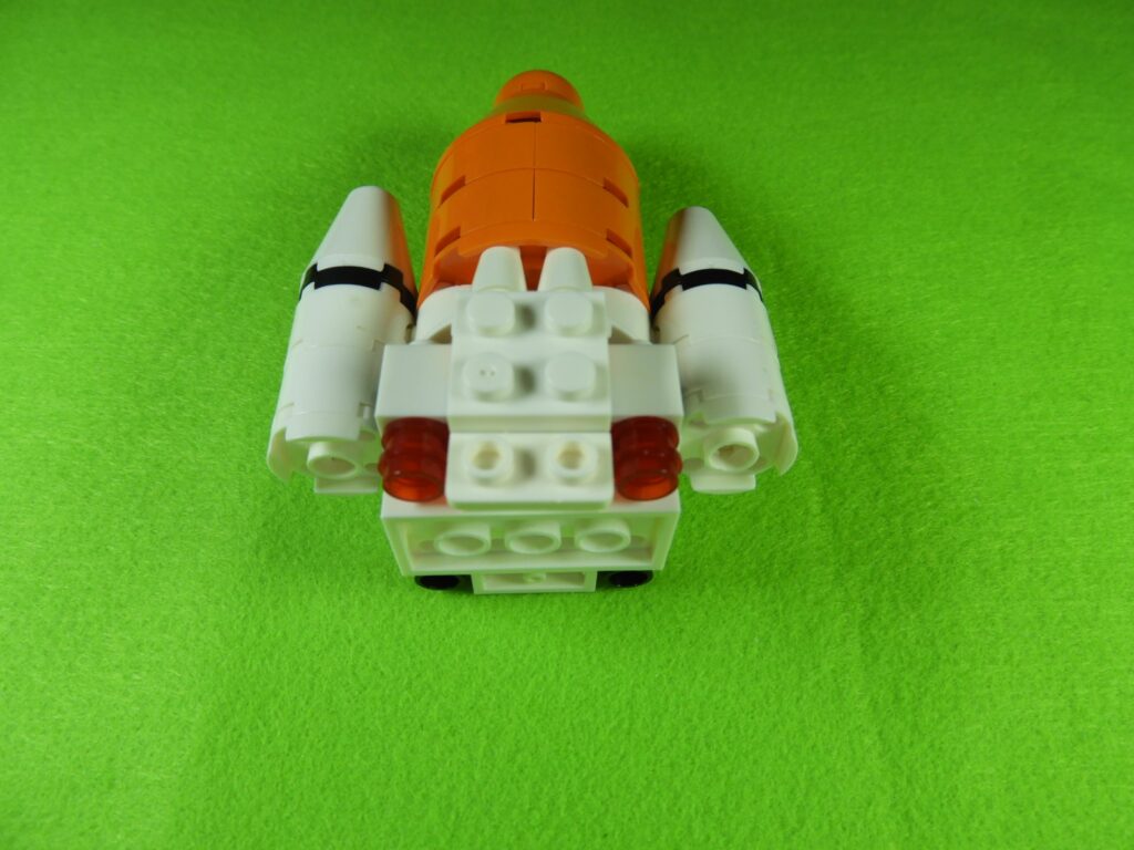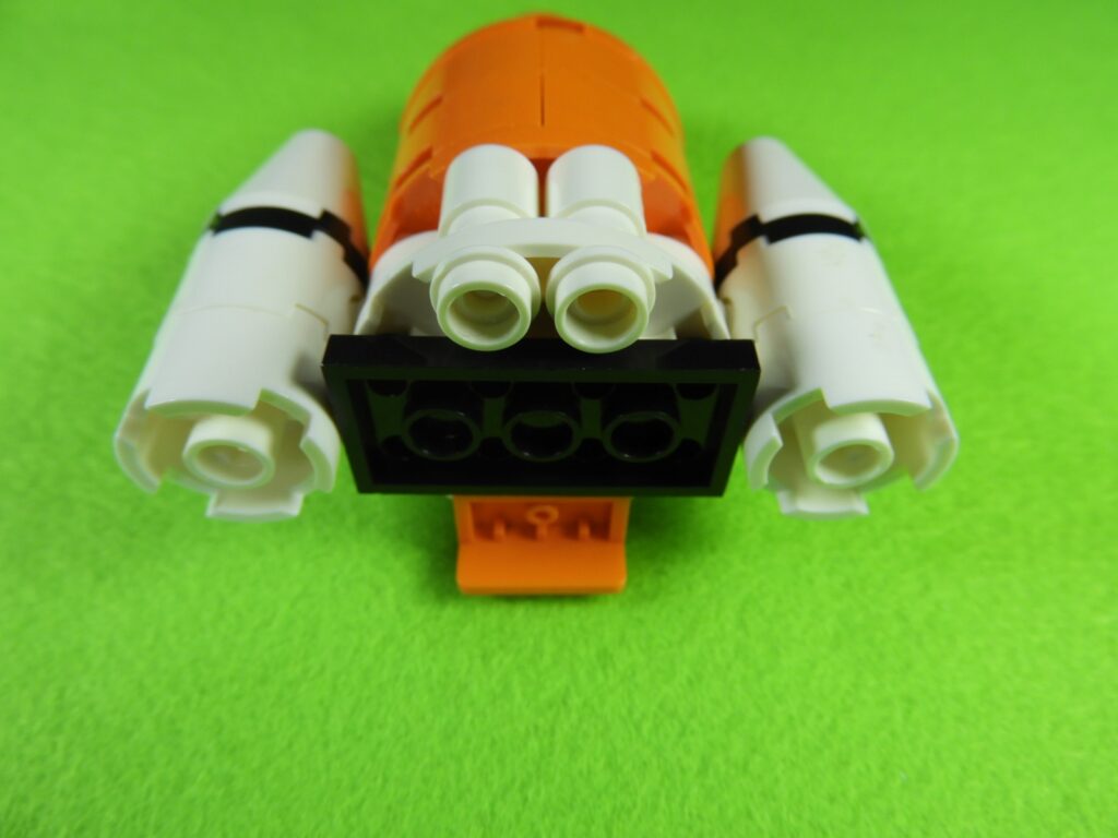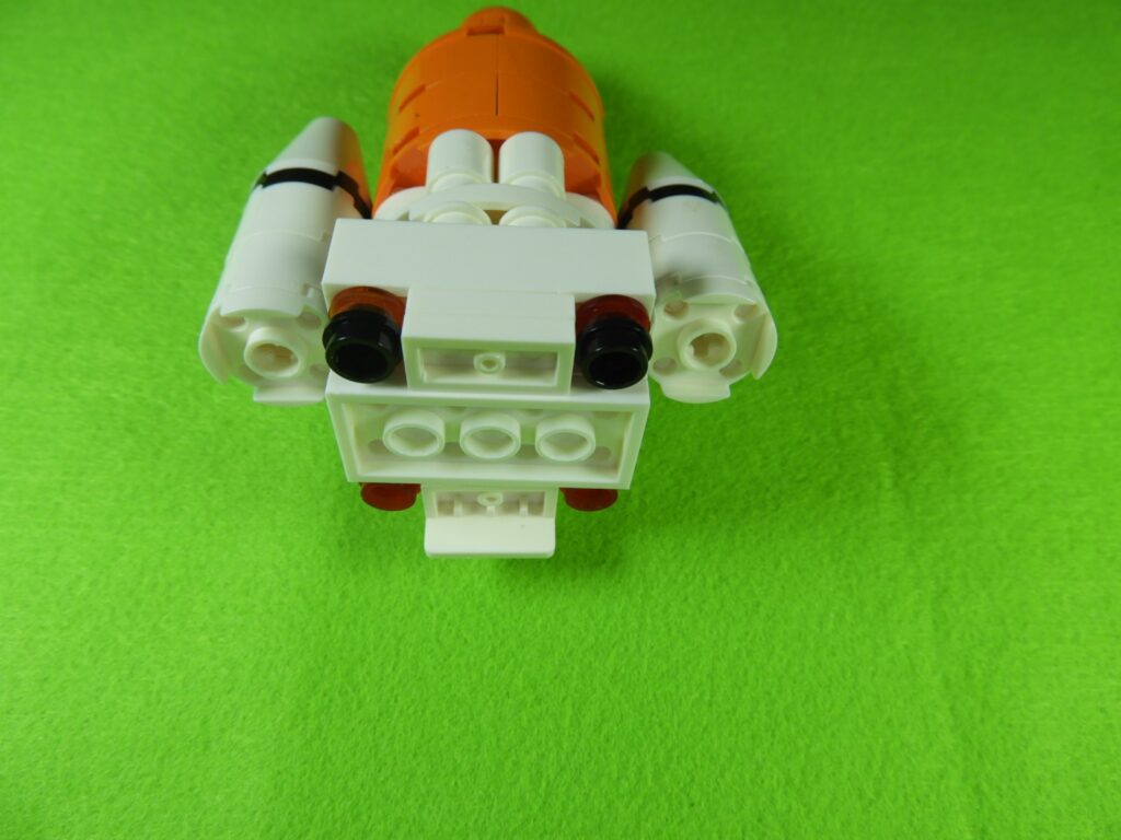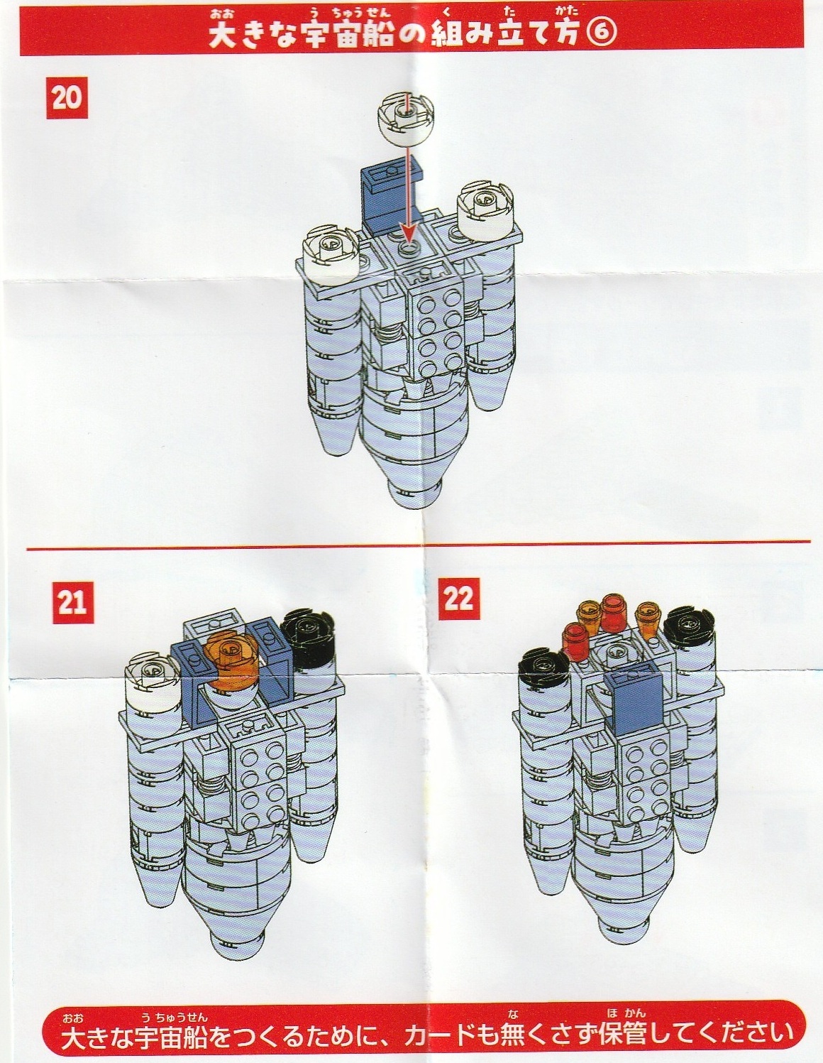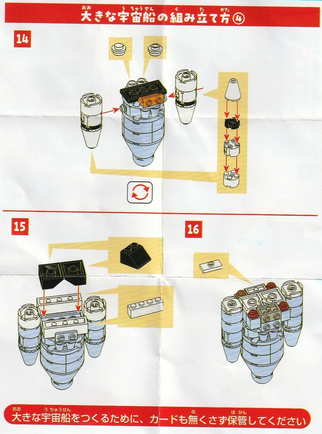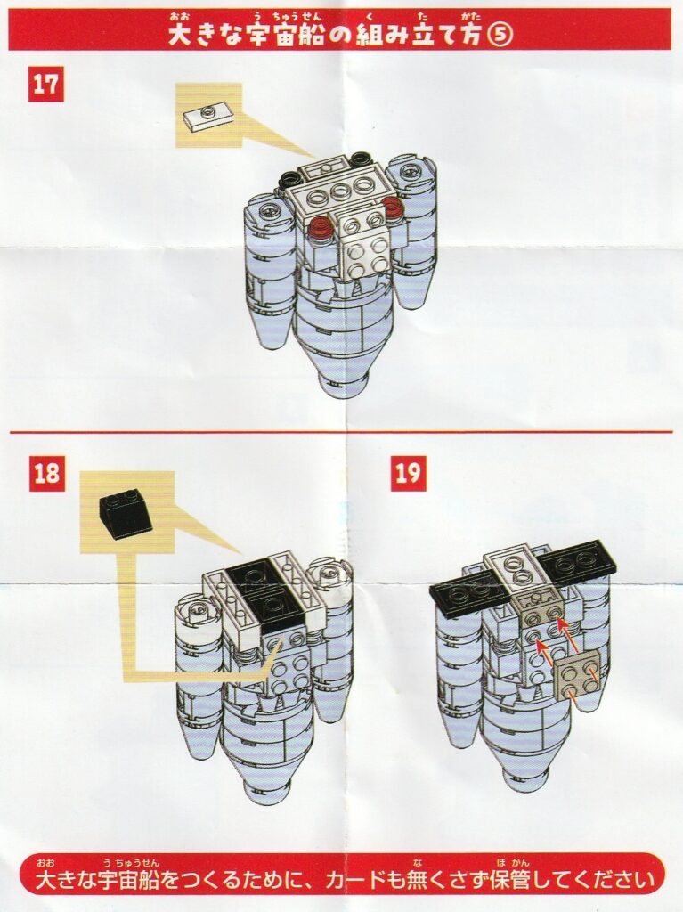 1.上記の一番下の白丸ブロック2個はロケットブースターの下に取り付けます。残りのブロックはロケットの下に取り付けると工程16番は完成です。