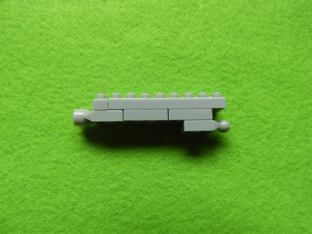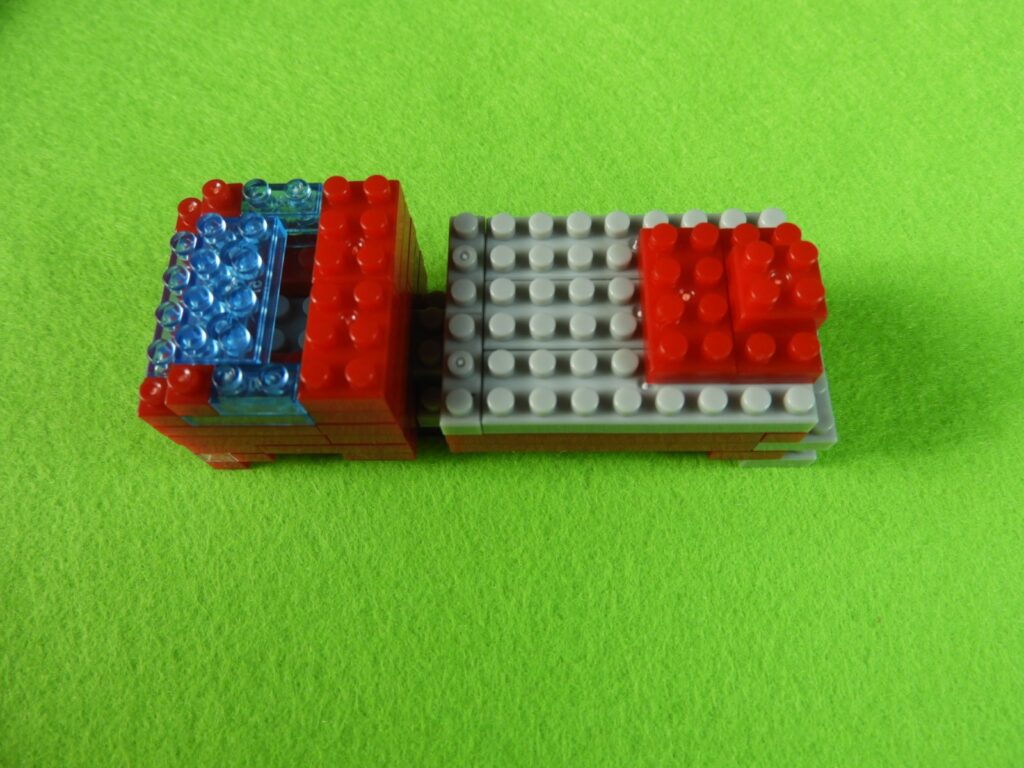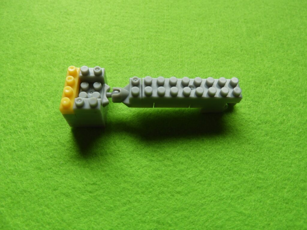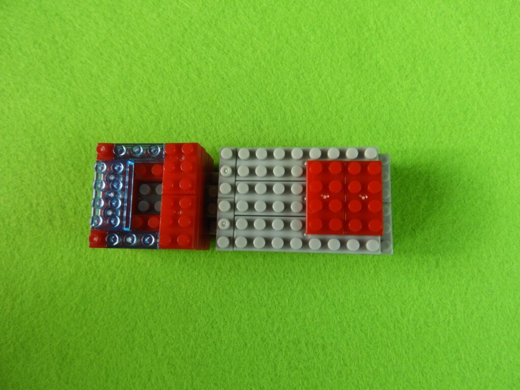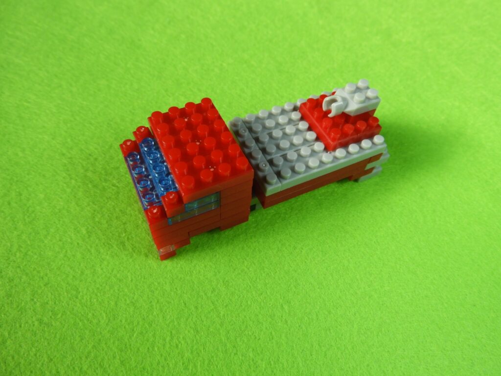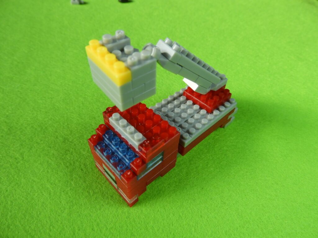 1.工程5番で組み立てた車両の前方に、用意したブロック3個をのせます。後方に工程1番で組み立てた、はしごを取り付けると工程6番は完成します。はしごを取り付けるときジョイント部分に入りにくい時は一度、車両側のグレーブロックを外して付けるとよいでしょう。