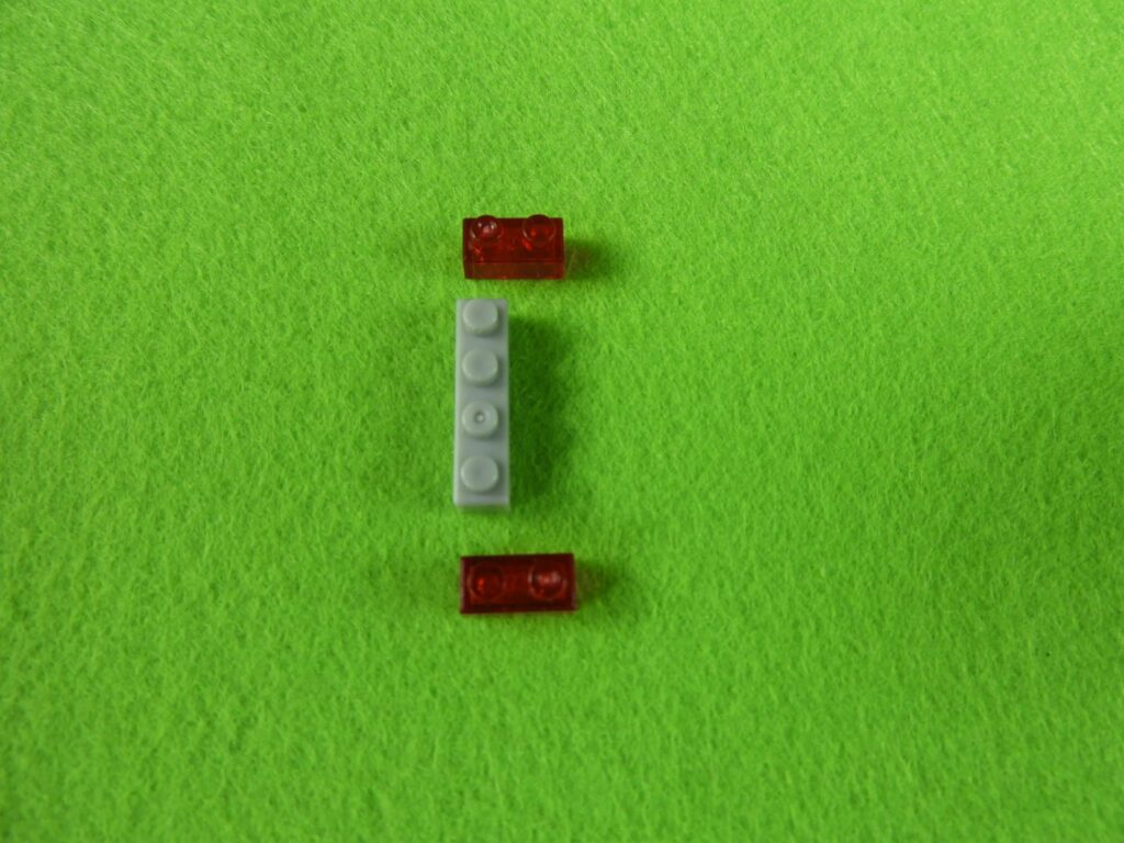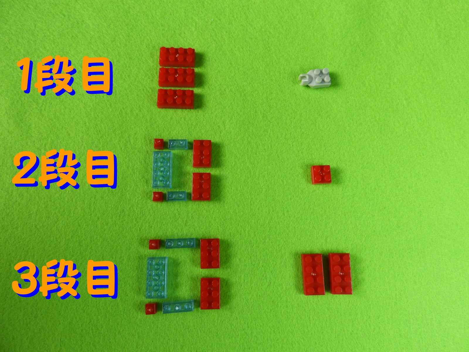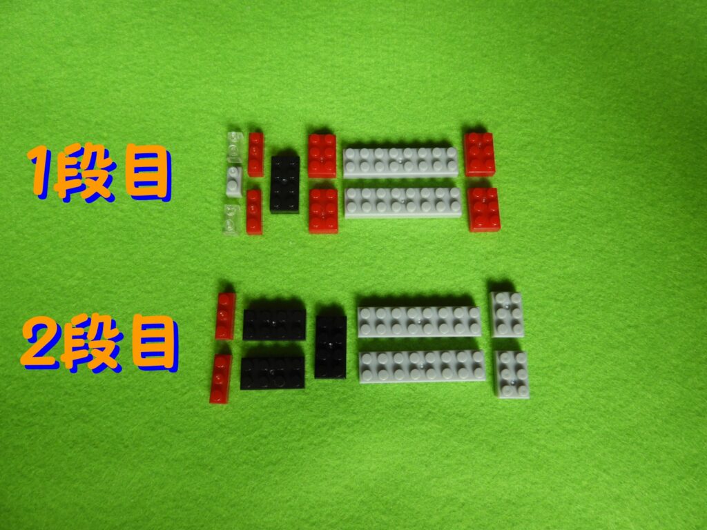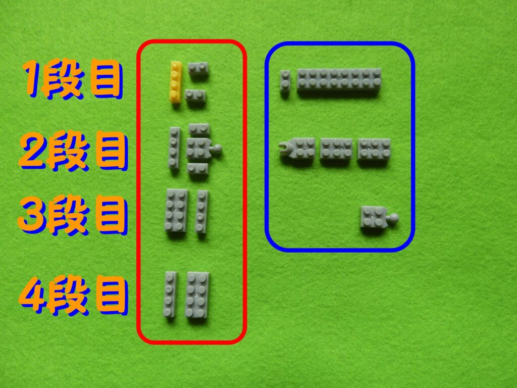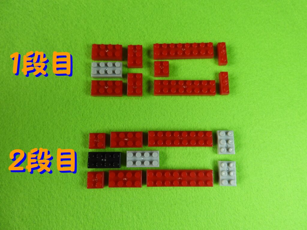 それでは工程1番で使用するブロックを並べます。1.赤枠、4段目のブロックの上に、3段目のブロックをのせます。