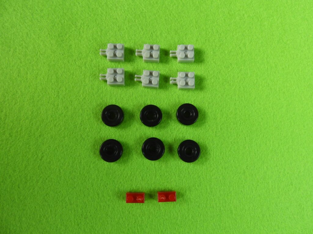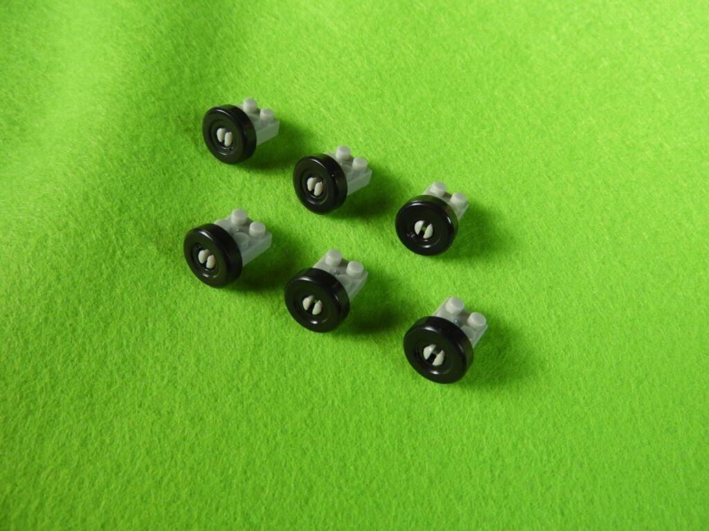 1.グレーのブロックにタイヤを取り付けます。タイヤは6セット出来上がります。