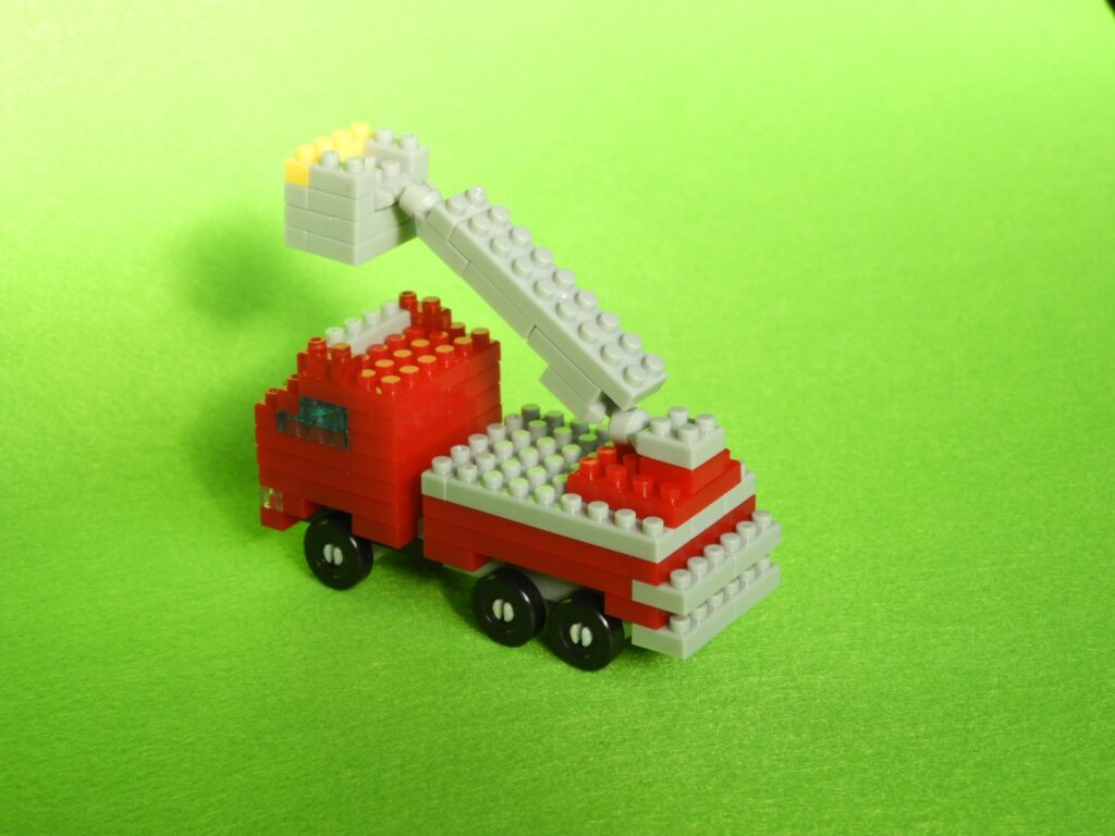 以上、ダイソーのプチブロック 消防車(はたらくくるま3)の作り方でした。消防者のはしご部分は2ヵ所可動させることができるので、はしごの位置を変えて楽しめますよ♪