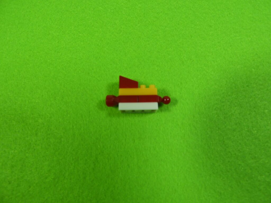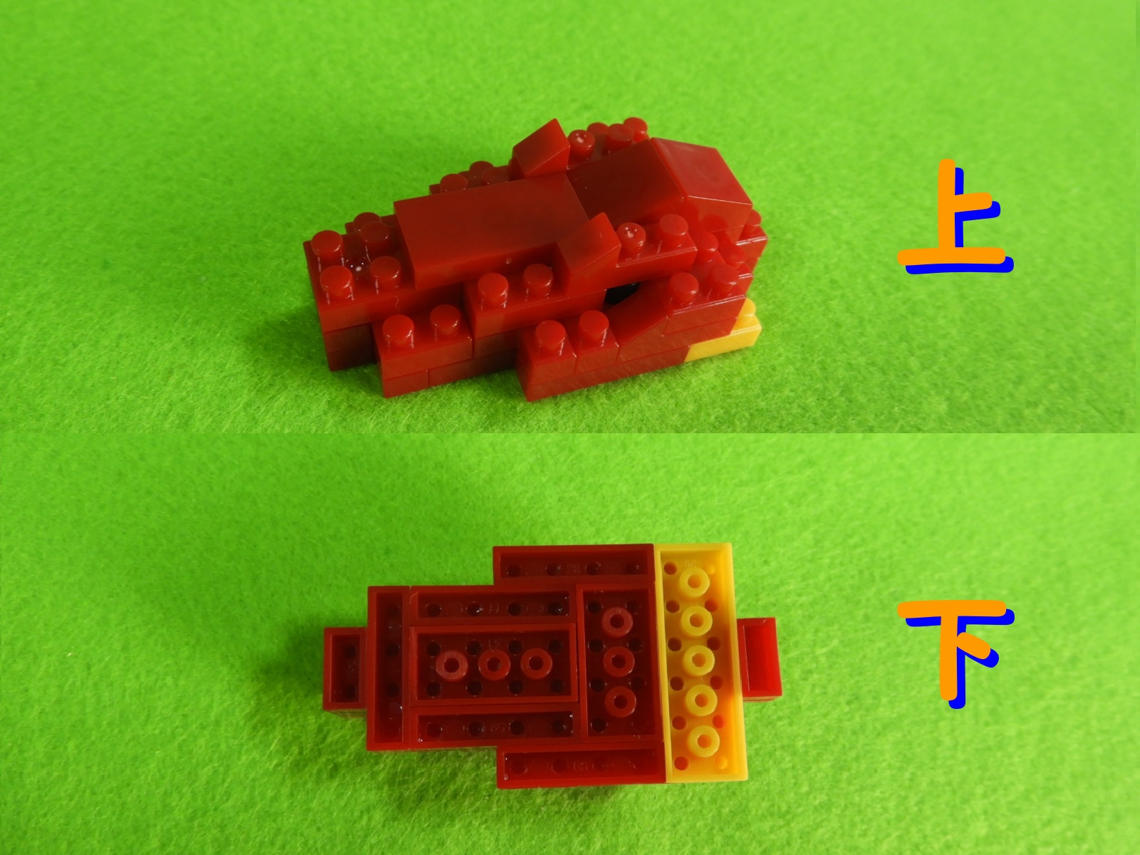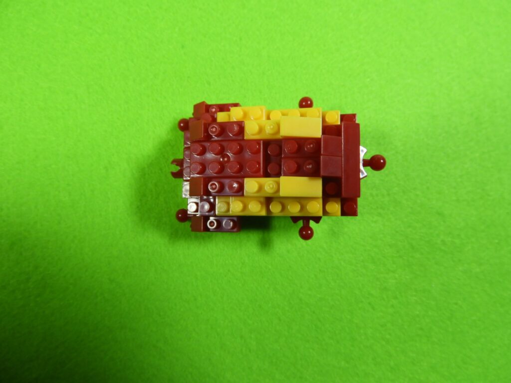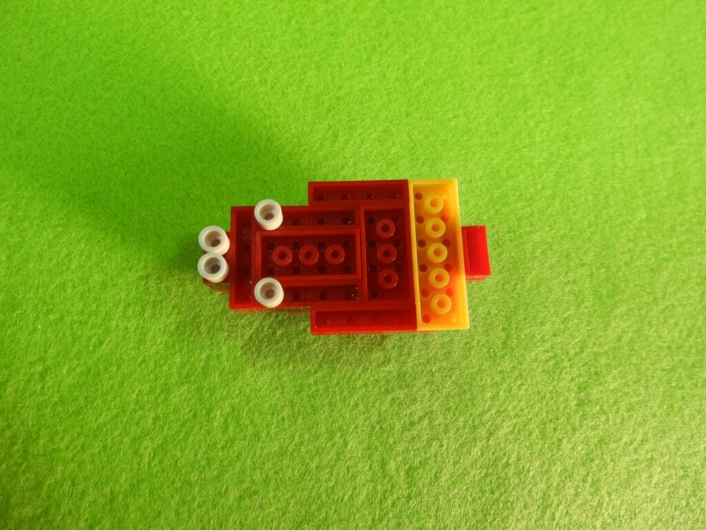 3.上記で組み立てたブロックの下に、3段目の赤ブロック1個を取り付けます。ここでブロックが1つにまとまりました。