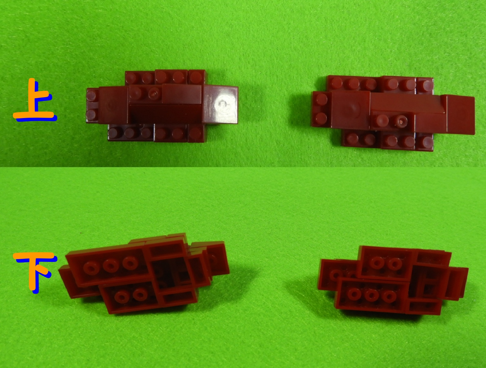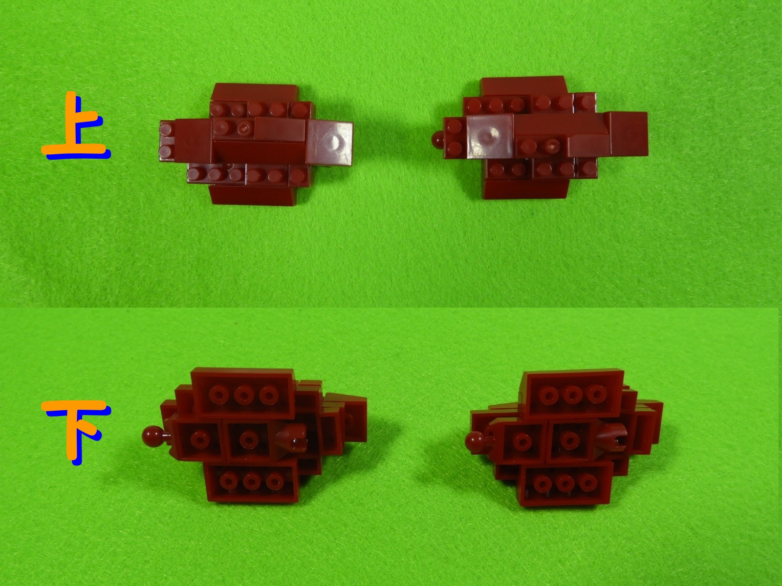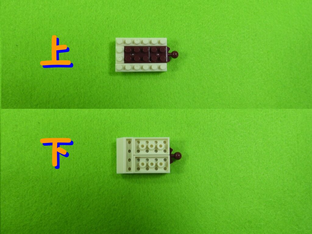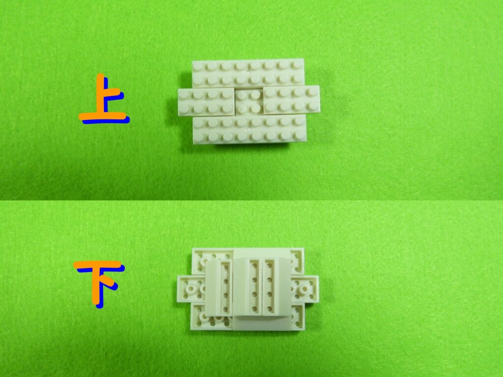 1.3段目のブロックの上に、2段目のブロックをのせます。下記写真は組み立てたブロックを上・下から見た時の写真になります。