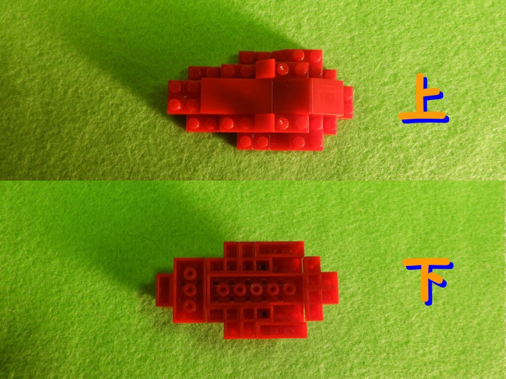1.6段目のブロックの上に、5段目のブロックをのせます。ここではブロック1個がバラけていますがOKです。上と下から見るとこんな感じになります。