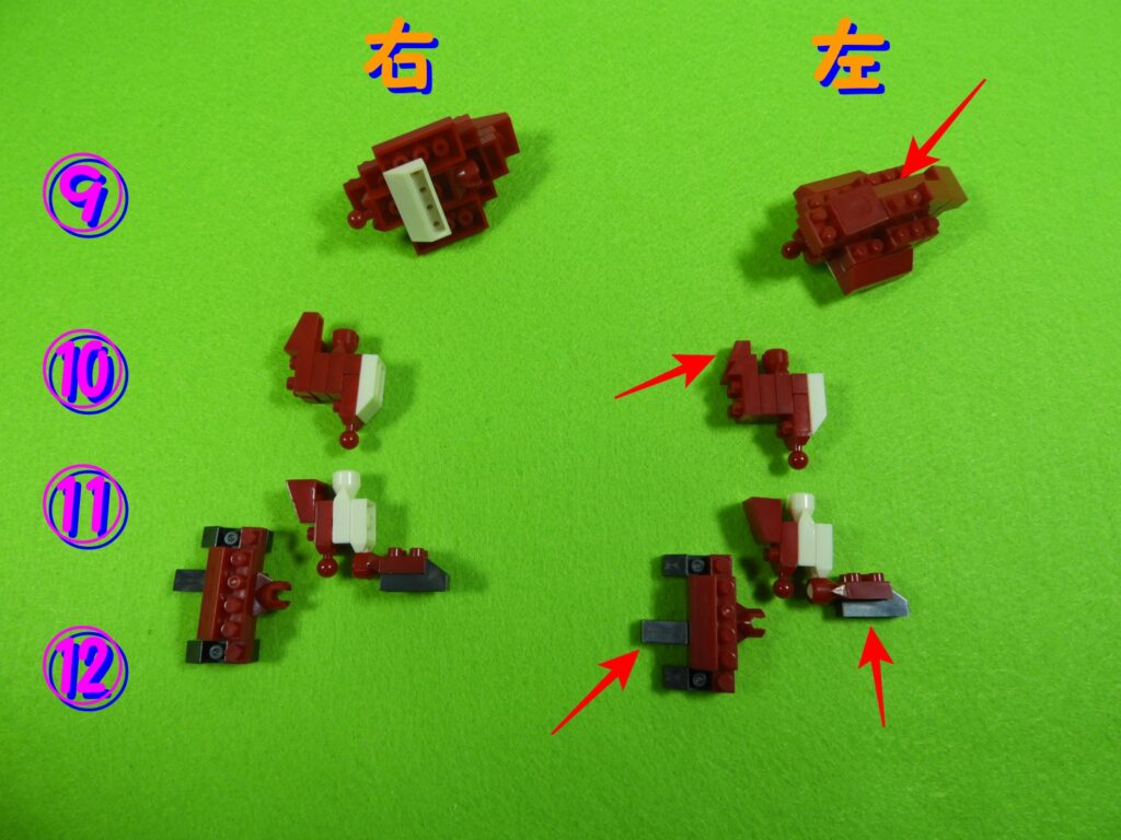 左右のパーツの見分け方は左側のパーツの場合、赤矢印部分をみればわかります。上から、9番パーツは上側(矢印側)が斜め、10番は奥に斜めブロックがついている、11番パーツは黒ブロックが奥についている、12番パーツは長い黒ブロックが下側についています。