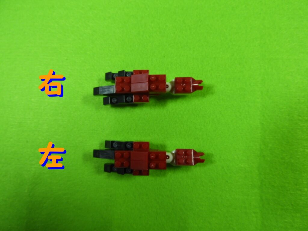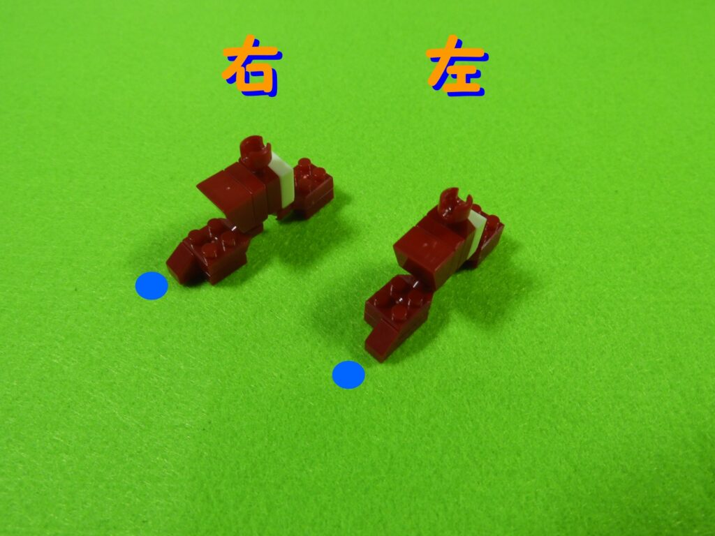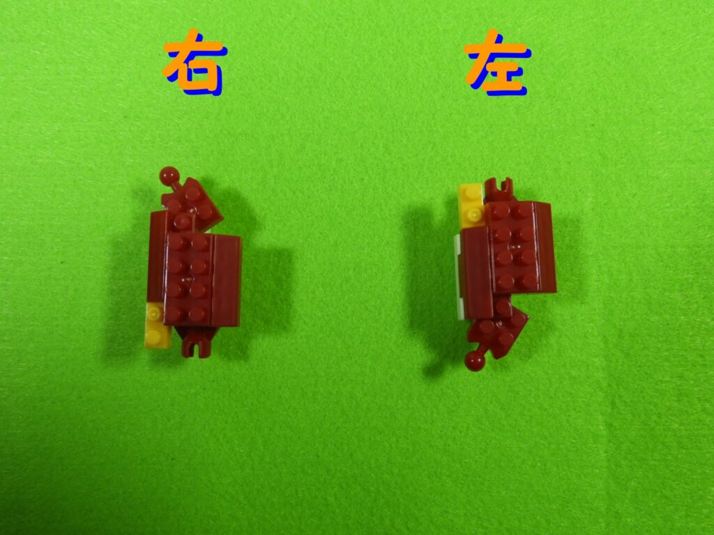 3つのパーツを接続するとこんな感じになります。ちなみに左右の違いは青丸のブロックの位置が違いますよ。