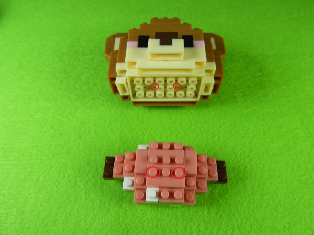 工程12番は胴体と頭を取り付けます。赤丸部分を目印に取り付けるとよいでしょう。