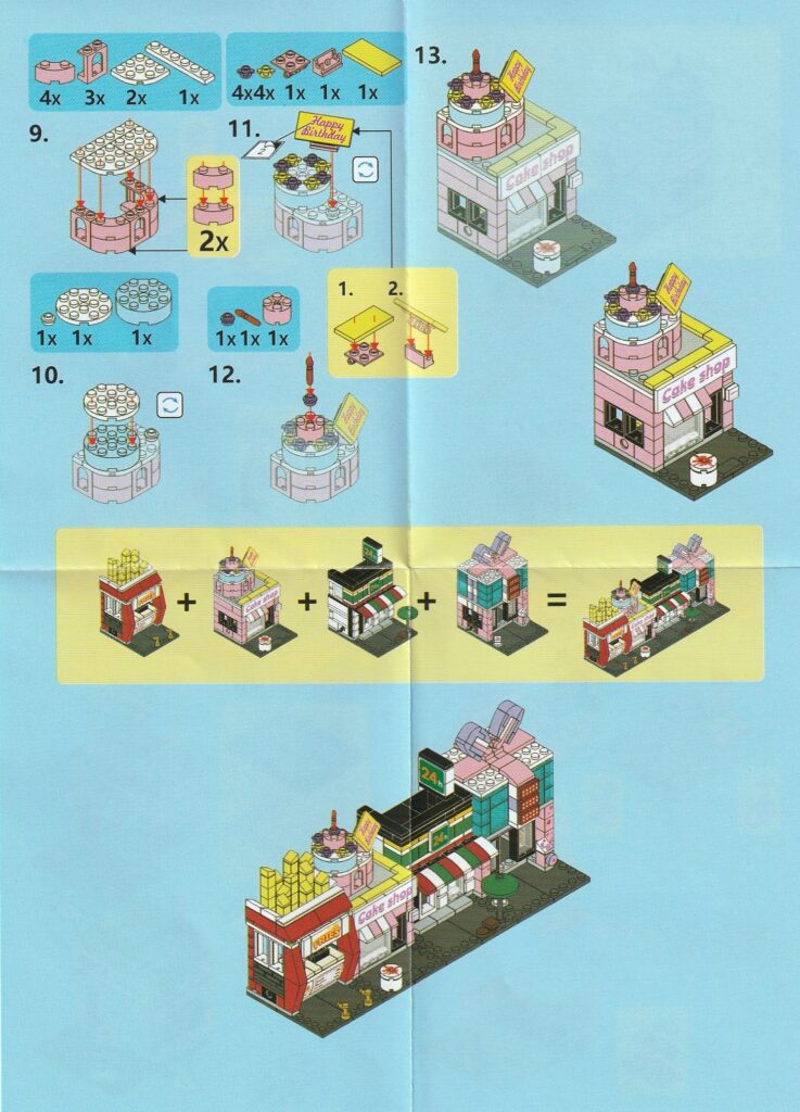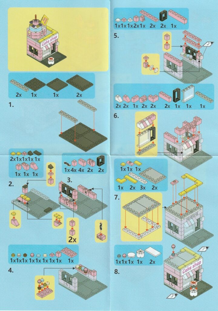 建物ブロック・ケーキショップの説明書はこちら、工程1番~工程8番まで