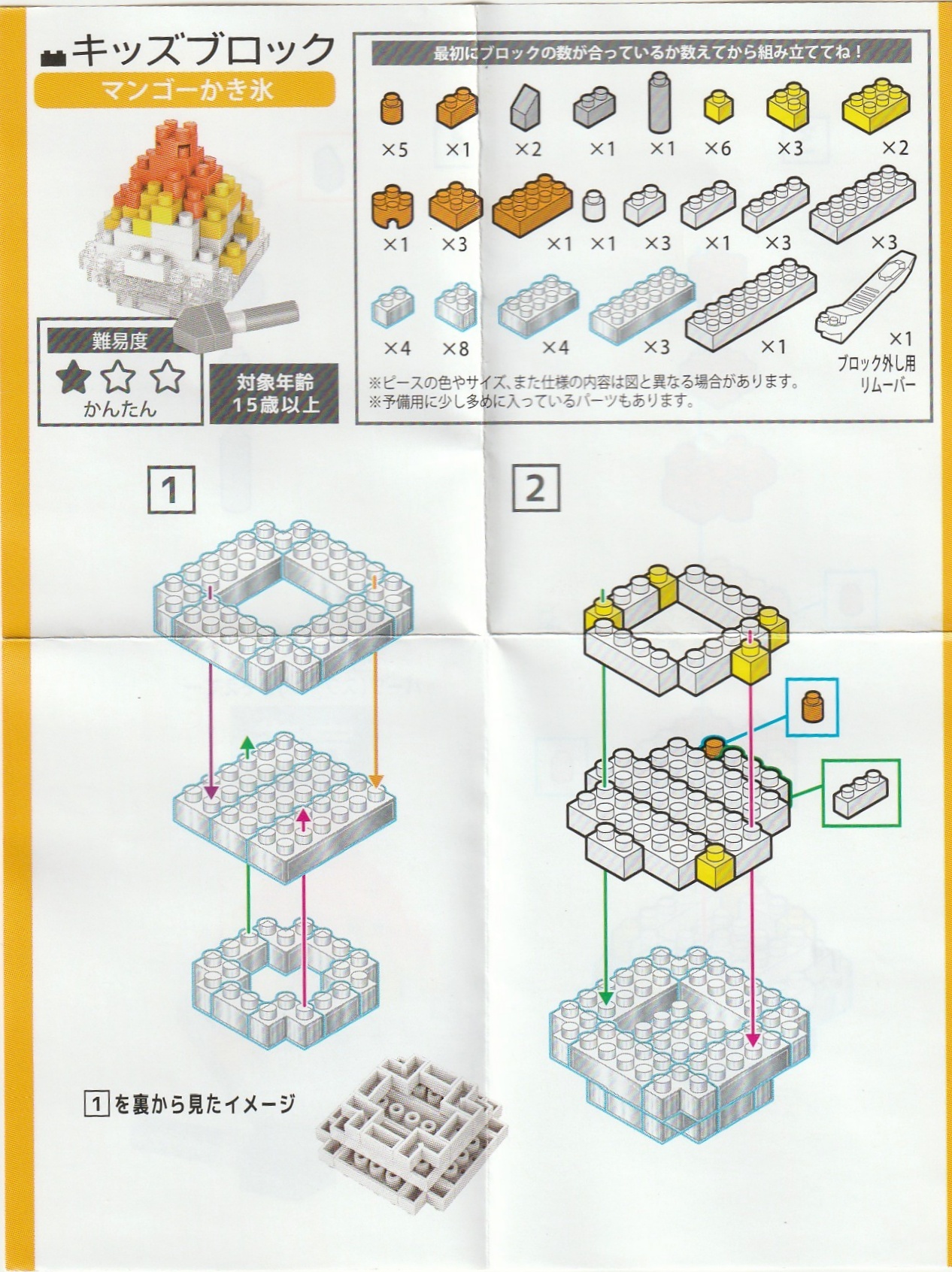 セリア★キッズブロック・台湾グルメ マンゴーかき氷の作り方を解説していきます。取扱説明書ものせておきましたので確認しながら作ってくださいね♪