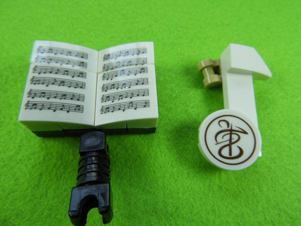工程12番・13番で組み立てたブロックにシールを貼り付けます。譜面台の左側はNo.3、右側はNo.1、丸いシールはNo.2です。