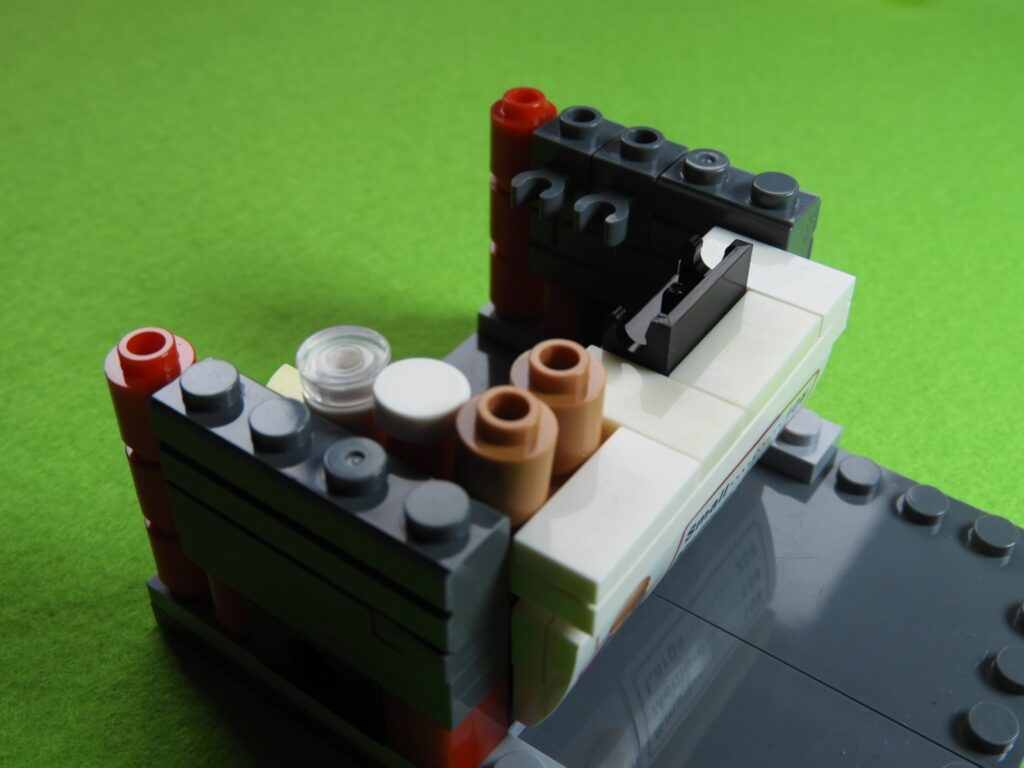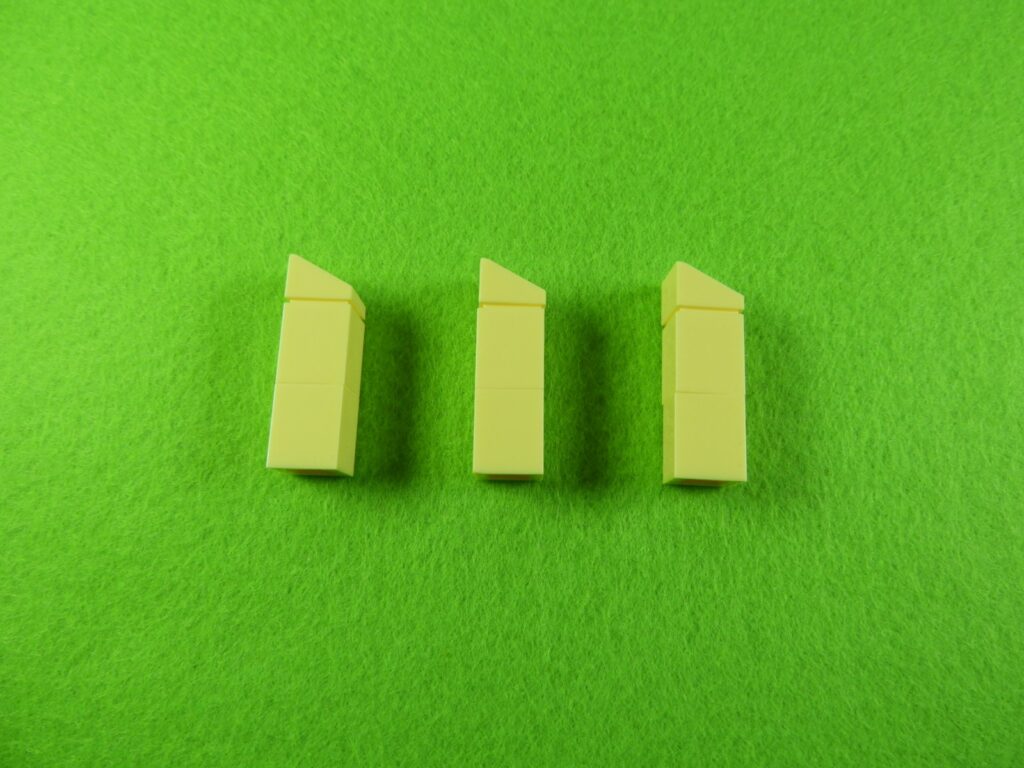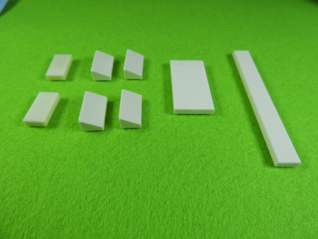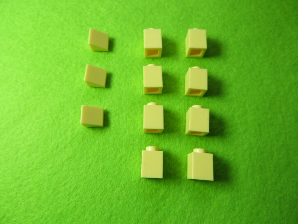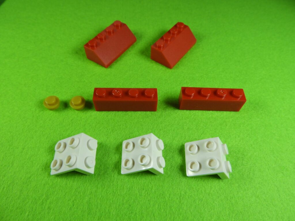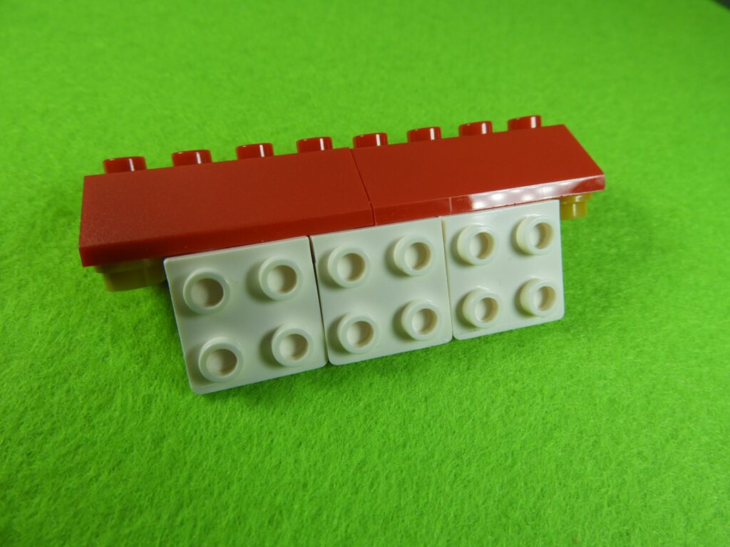 それでは工程11番で使用するブロックを並べます。1.用意したブロックを下記写真のように組み立てて、同じものを3セット作ります。2.上記で組み立てたブロックを屋根に取り付けると工程11番は完成します。