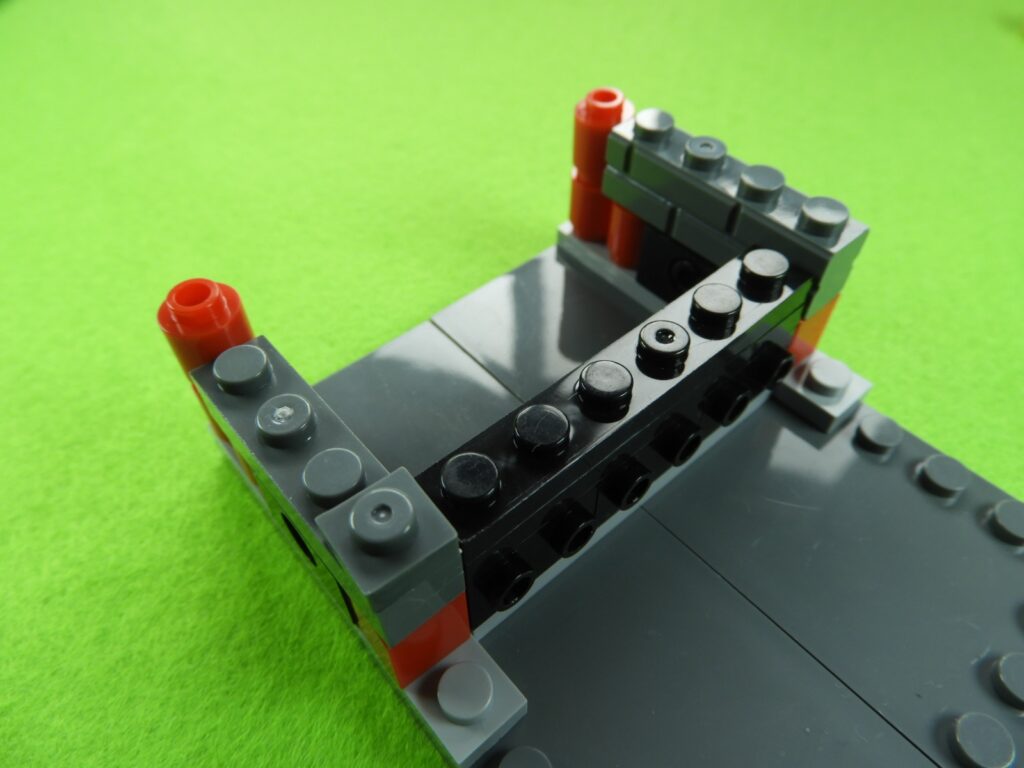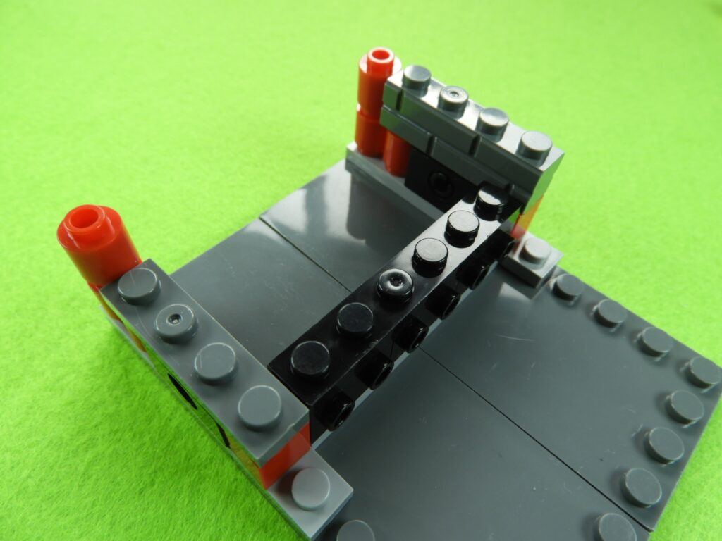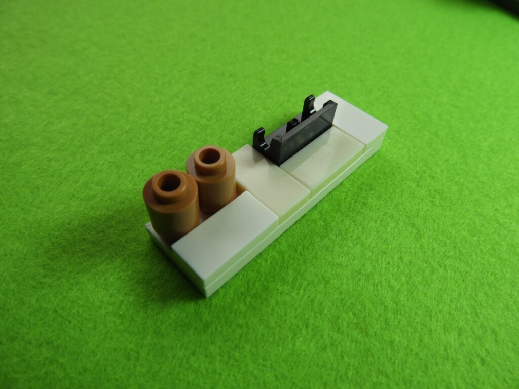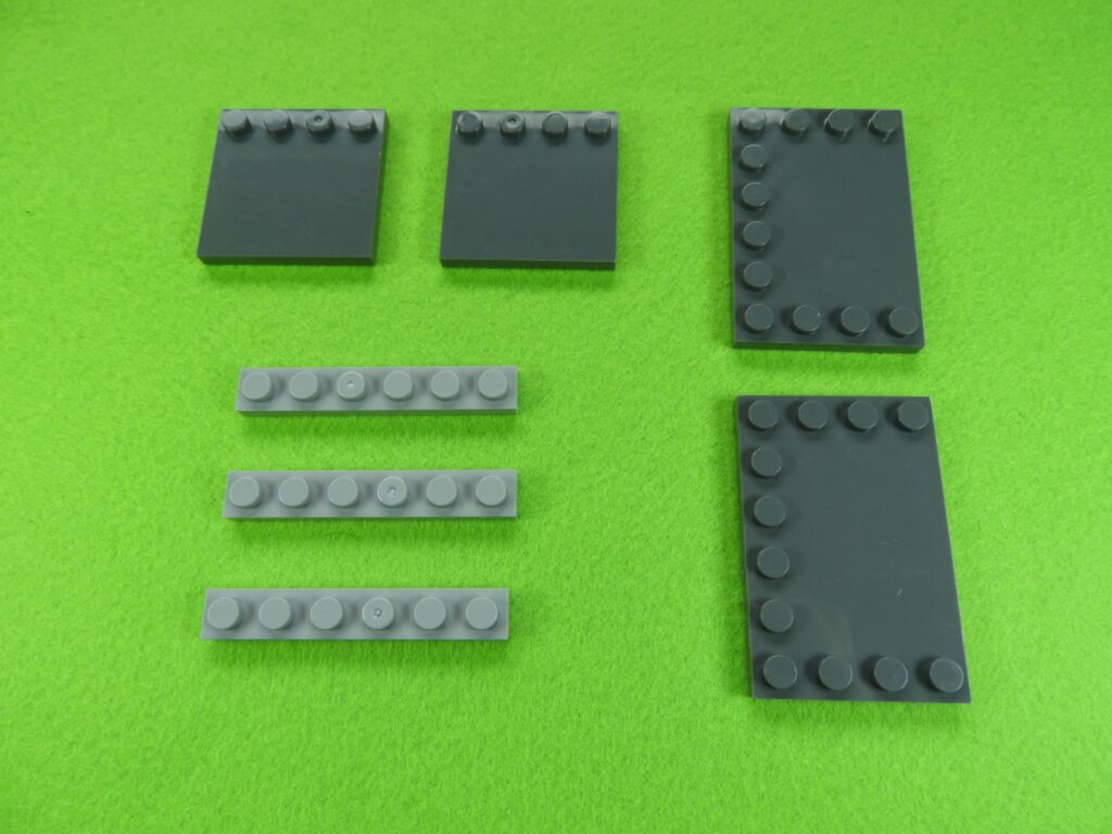 それでは工程3番で使用するブロックを並べます。1.最初に、工程2番で組み立てたブロックの上にブロック5個をのせます。2.次に残りのブロック3個、グレー(1×3)、黒(1×6)、グレーの小さい正方形ブロックをのせるとOKです。