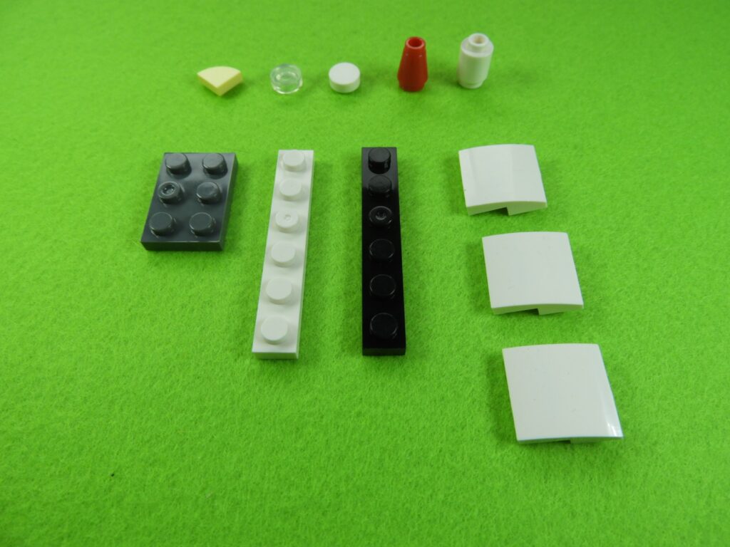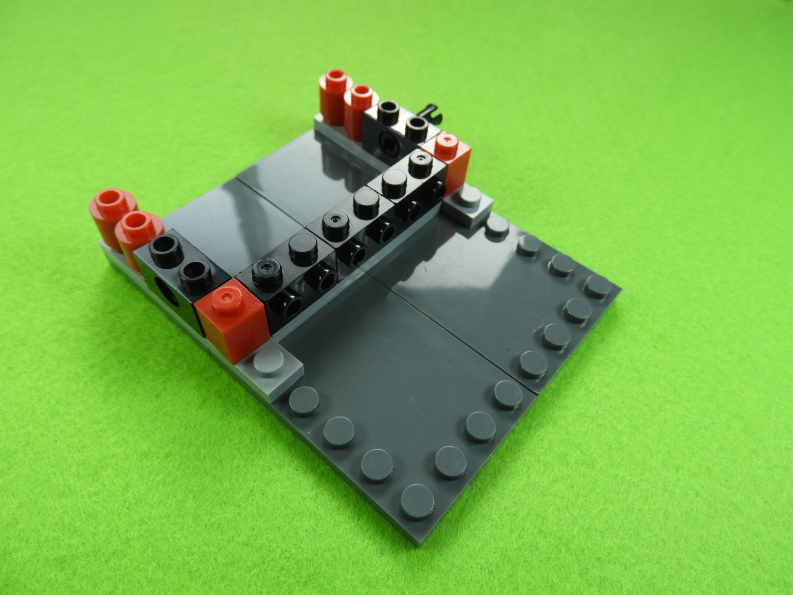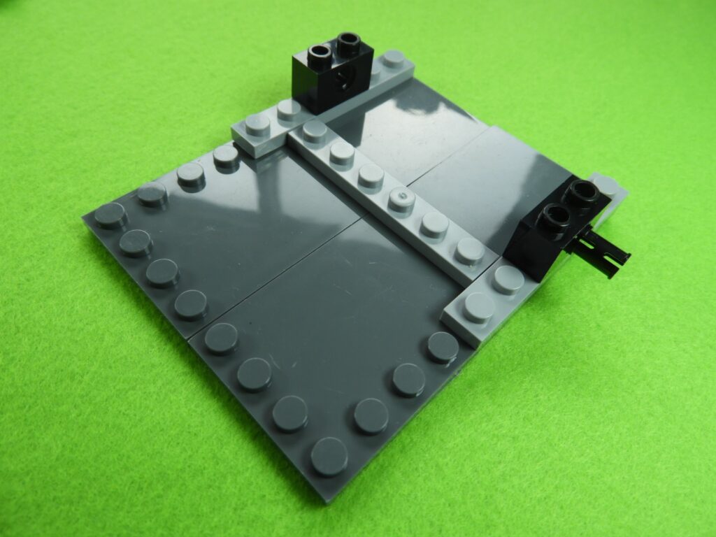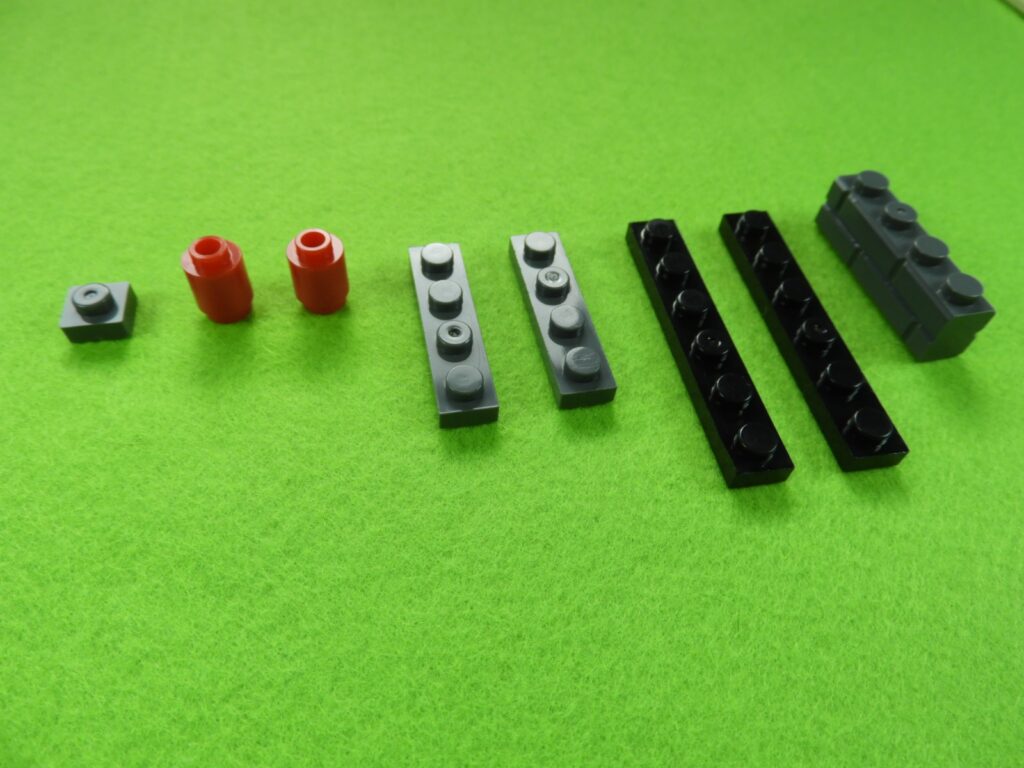 それでは工程3番で使用するブロックを並べます。1.最初に、工程2番で組み立てたブロックの上にブロック5個をのせます。2.次に残りのブロック3個、グレー(1×3)、黒(1×6)、グレーの小さい正方形ブロックをのせるとOKです。