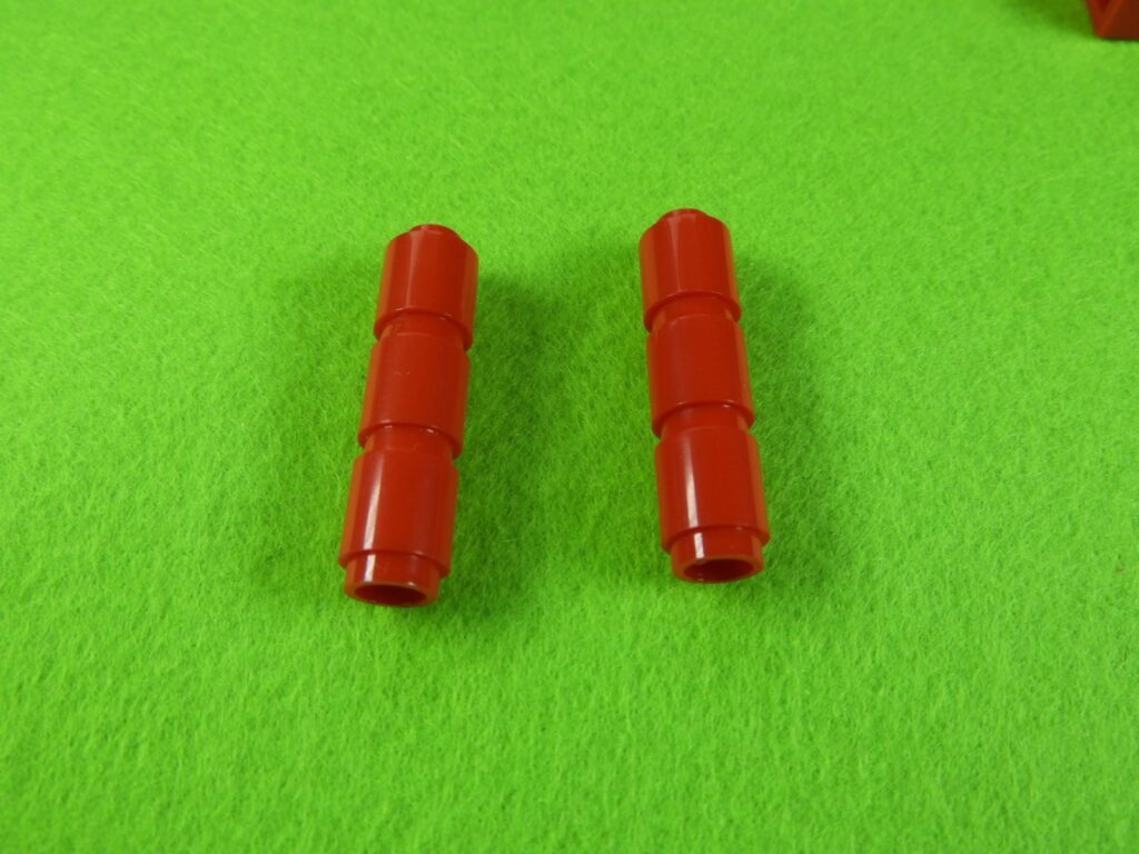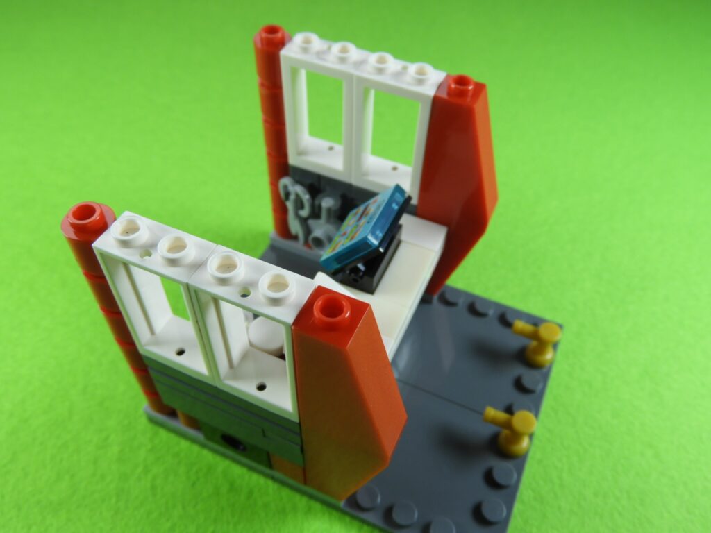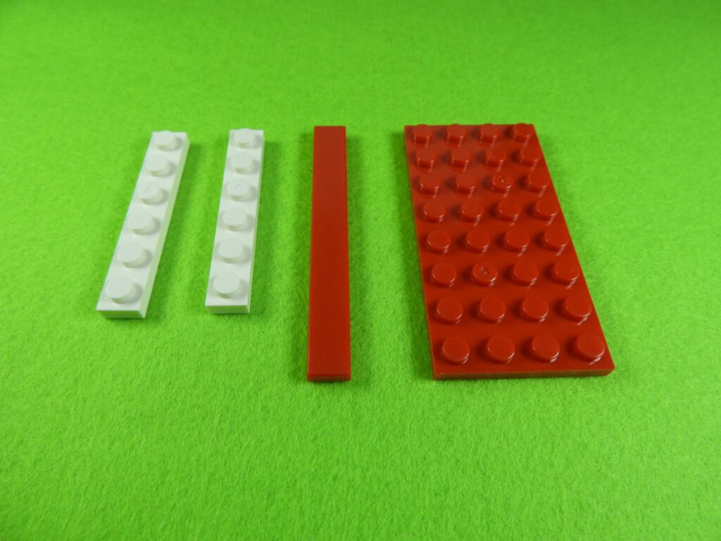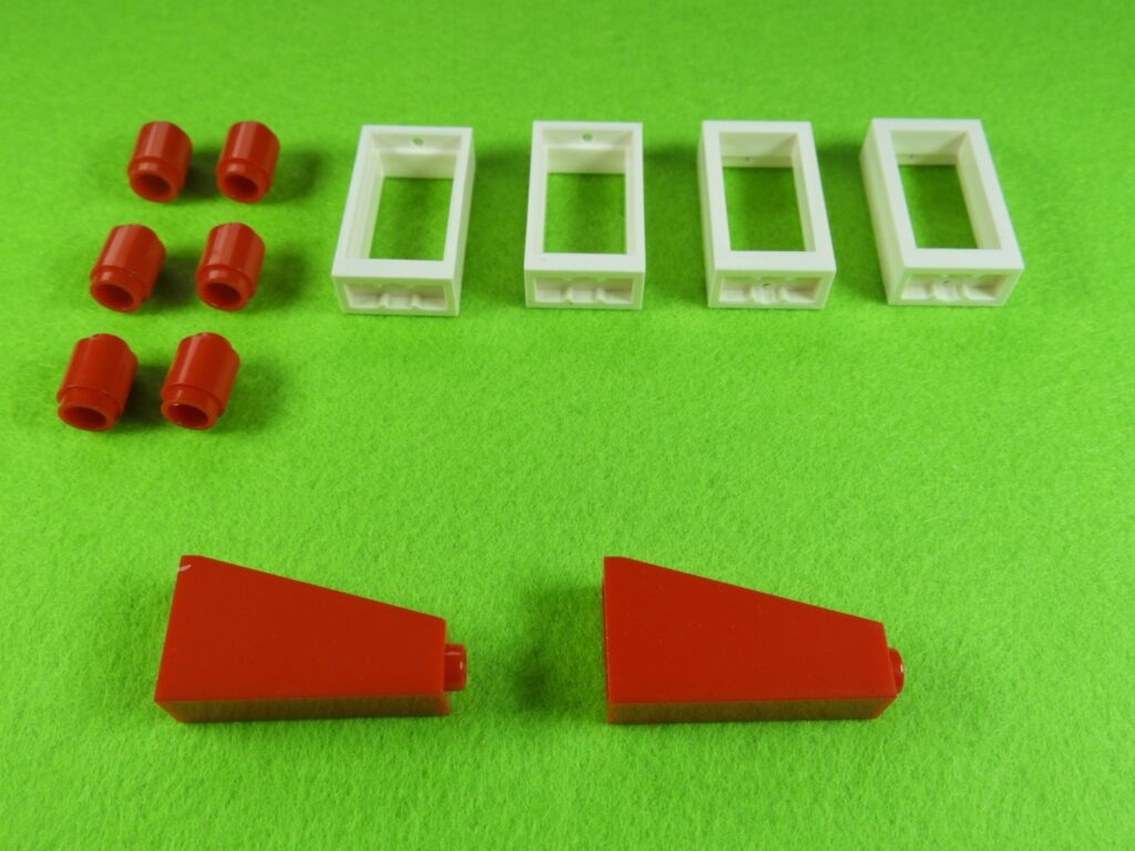 それでは工程7番で使用するブロックを並べます。1.赤ブロック3個をつなげて同じものを2セット作ります。2.上記で組み立てたブロックと残りのブロックを取り付けます。白い窓枠には小さい穴が開いているので外側に向けて取り付けてくださいね。