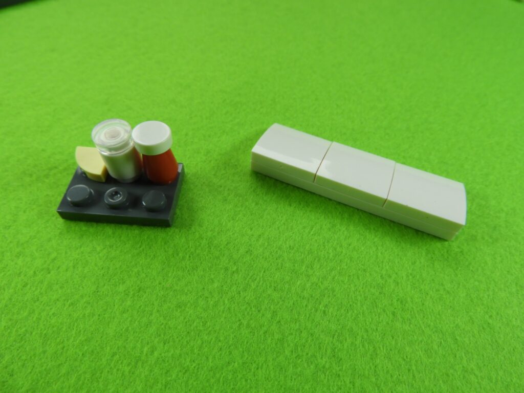 それでは工程13番で使用するブロックを並べます。1.用意したブロックを下記写真のように組み立てます。2.上記で組み立てたブロックを屋根に取り付けると建物ブロック(1)・バーガーショップは完成します。作業お疲れ様でした♪