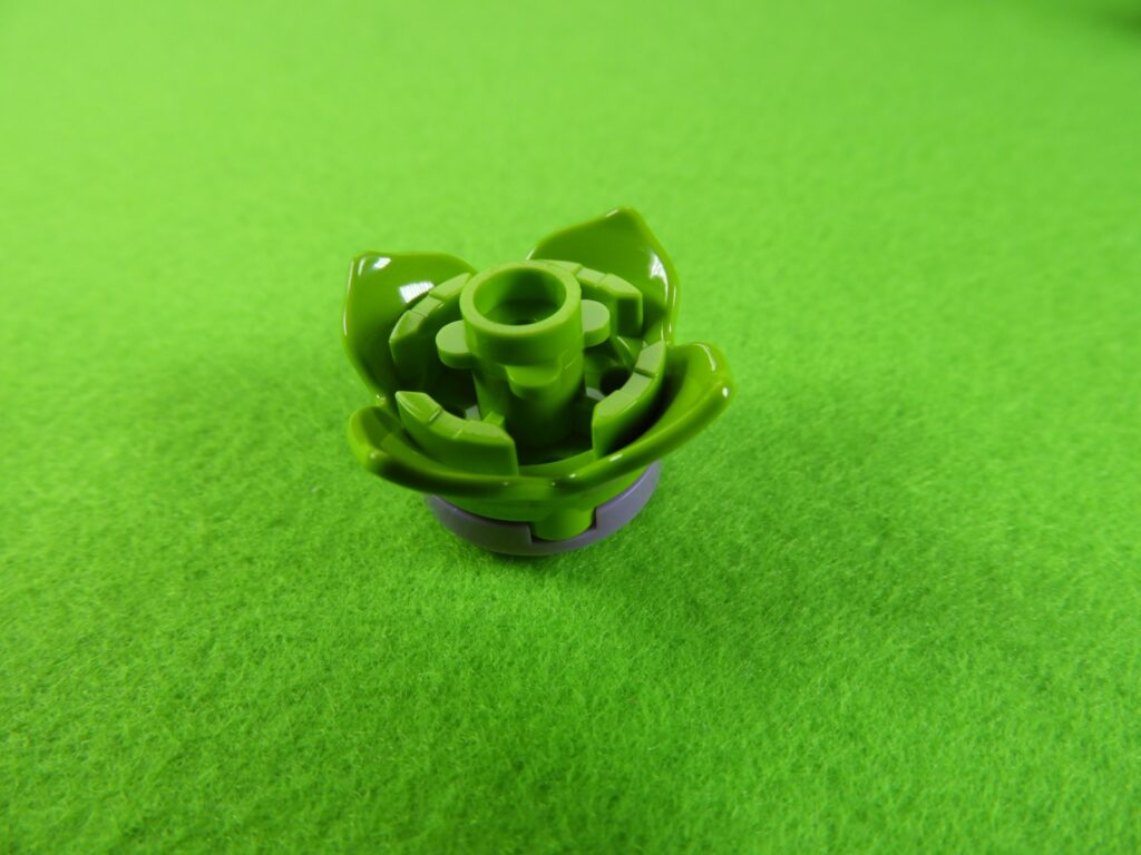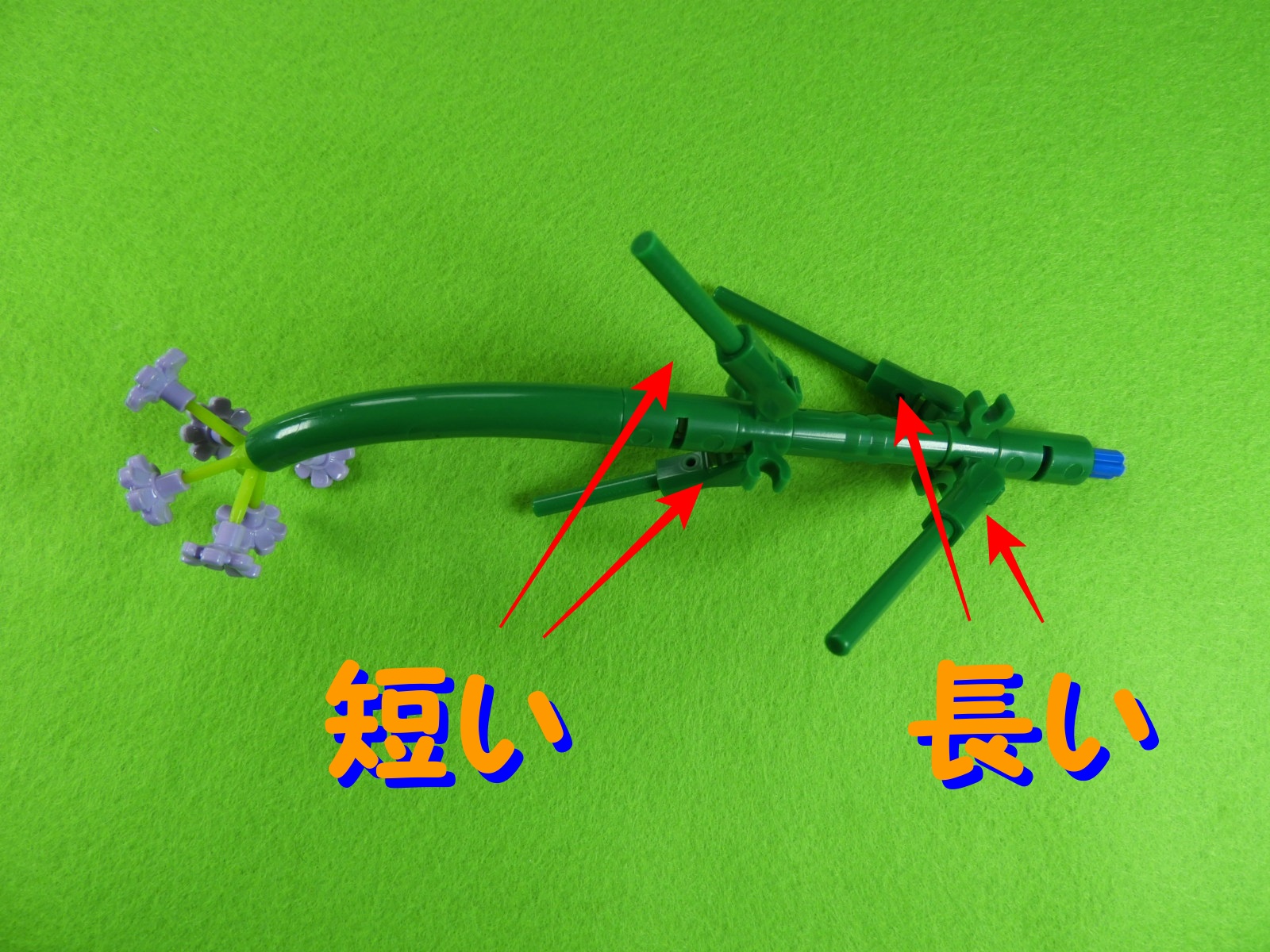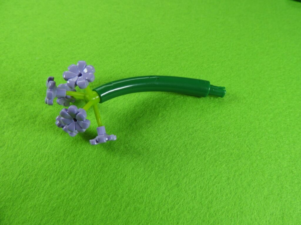 花の裏側に、小さい緑ブロックを取り付けてから長い緑ブロックを取り付けます。
