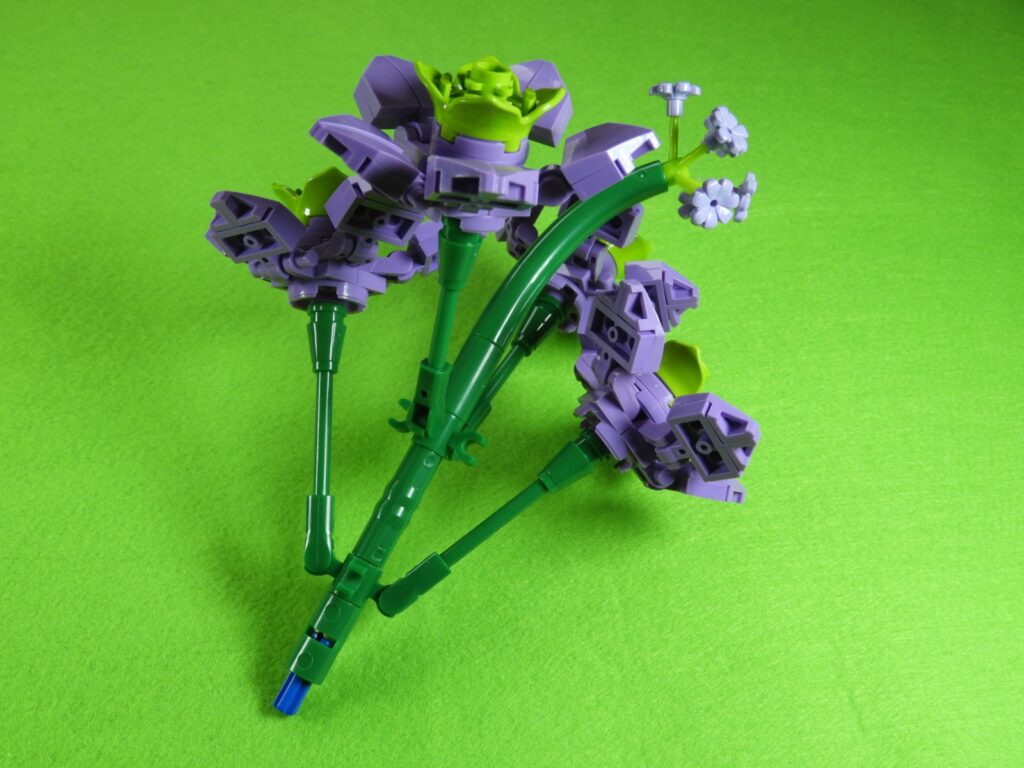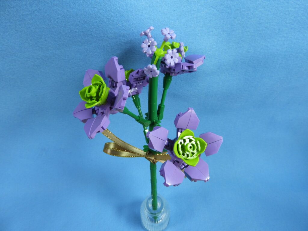 青ブロックに工程1番で組み立てたブロックを差し込むみます。あとは付属の紐を結び付けて見栄えよくすれば、すみれが完成します。作業お疲れ様でした♪