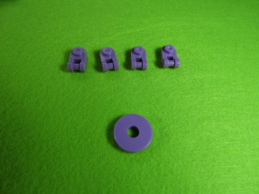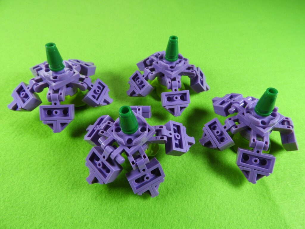 1番で組み立てたブロックの上に、小さいブロック4個を取り付けてから丸いブロックを取り付けます。同じものを4セット作ります。