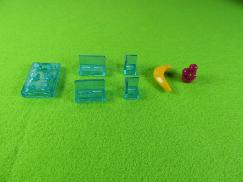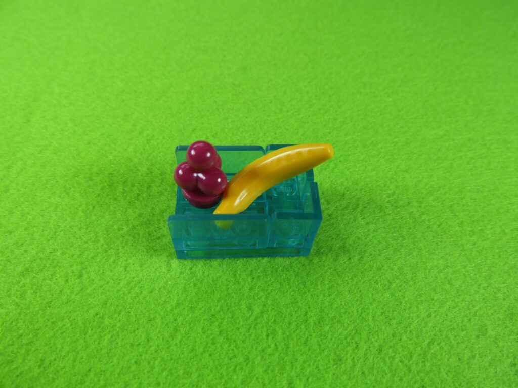 1,用意した水色ブロックを下記写真のように組み立てて中に果物を入れます。