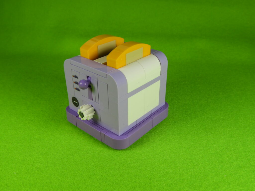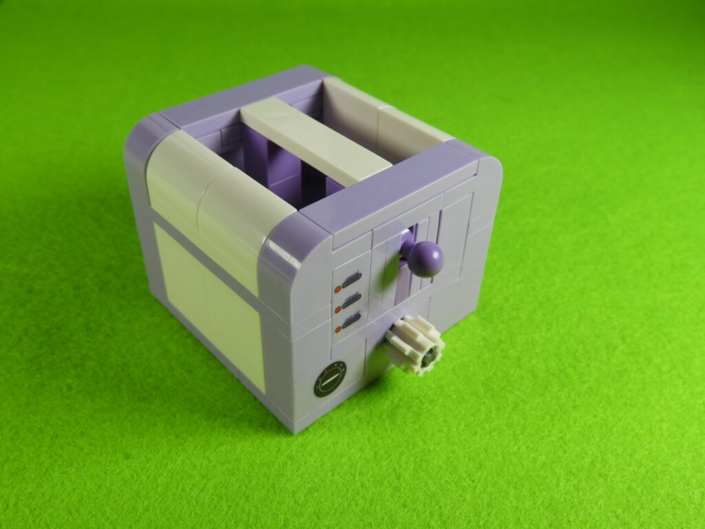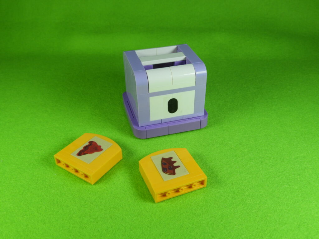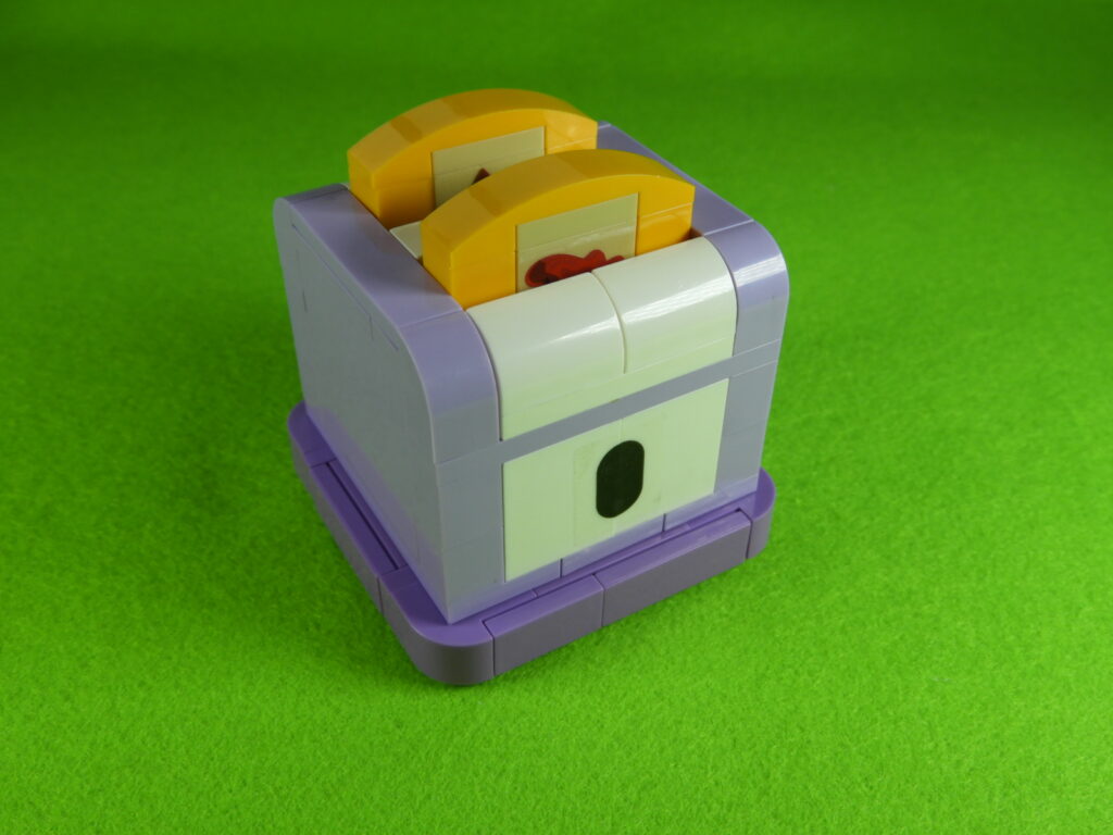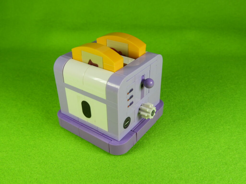完成したブロック トースターをいろんな角度から撮影してみました。パン2枚をトースターから取り出してみました。
