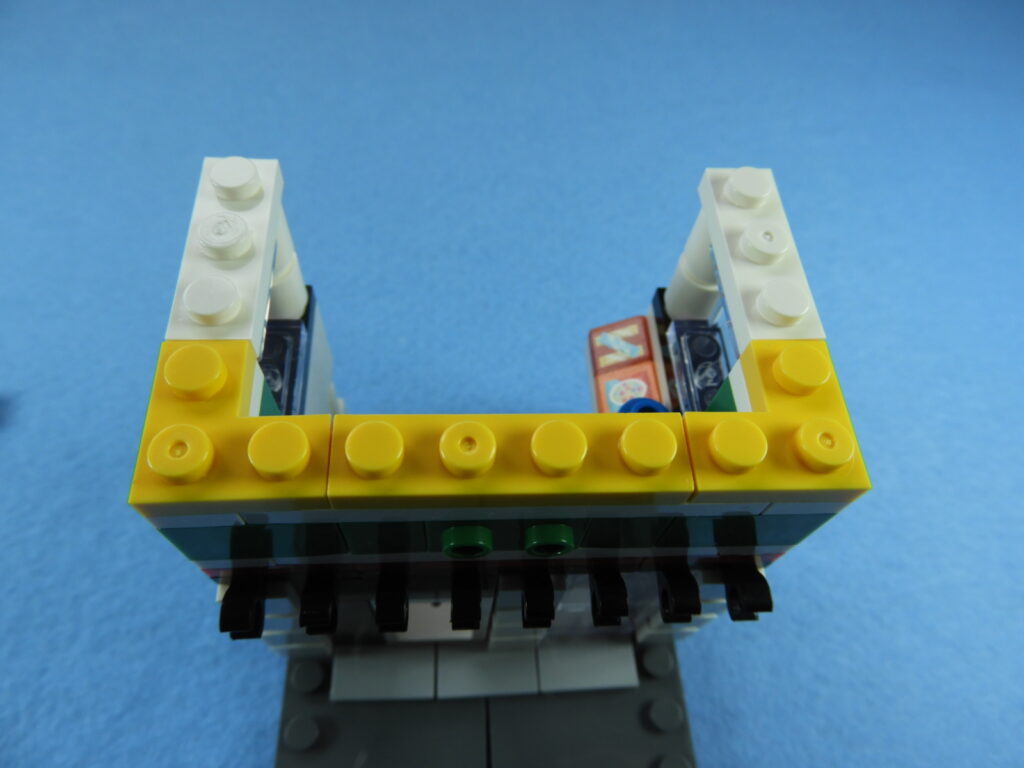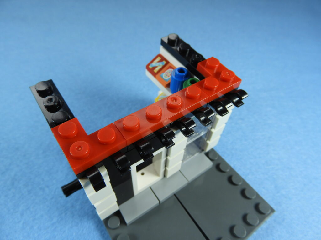 1.用意したブロックを下記写真のように工程8番で組み立てたブロックの上に取り付けます。黒ブロック1個(1×2)はまだ固定されていません。下記写真のようにのせるだけでOKです。