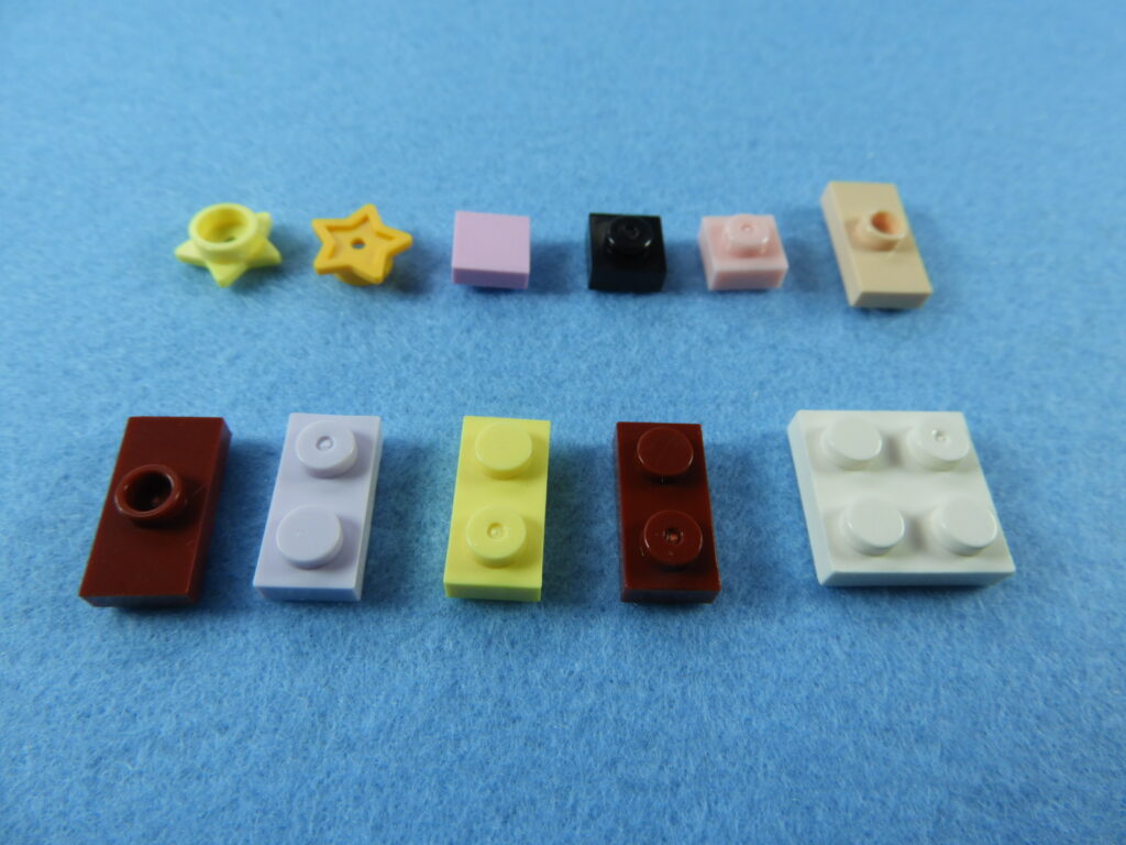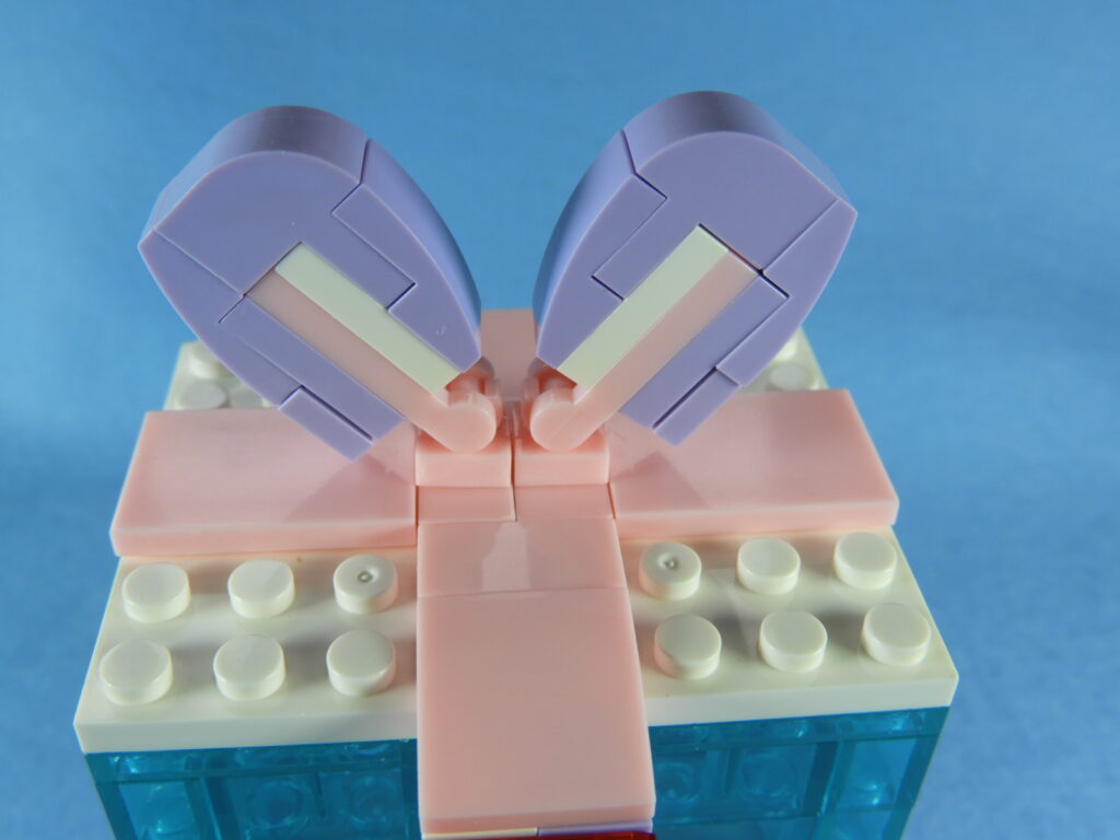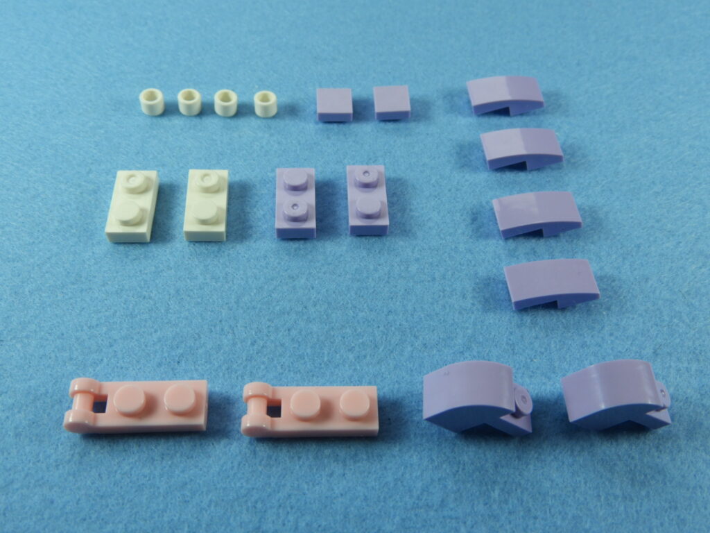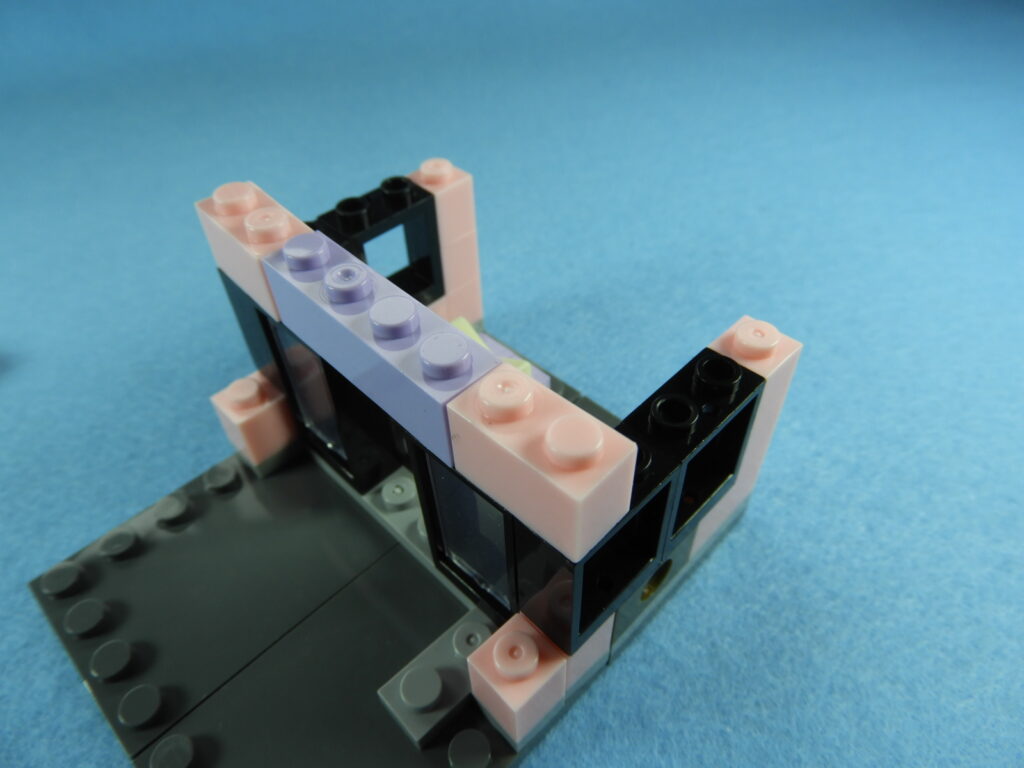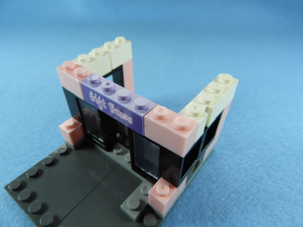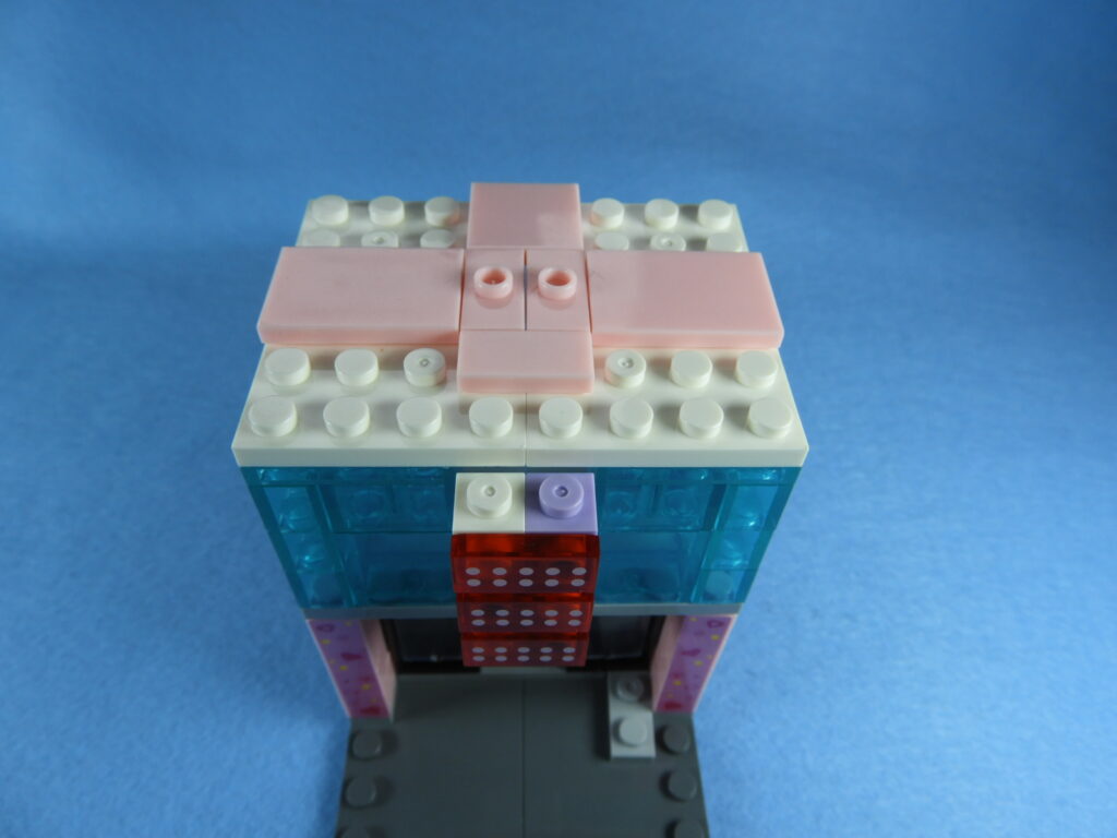 それでは工程12番で使用するブロックを並べます。1.用意したブロックを下記写真のように組み立てます2.下記白ブロックを紫ブロックに取り付けますが、直接取り付けるときにはまらないときは以下の方法で取り付けるとはまると思います。2.下記写真のように白ブロックを置いたら、1番で組み立てた紫ブロックを上から押し付けるとはまりやすいです。3.こんな感じに白ブロック4個を取り付けます。4.残りのブロックを下記写真のように取り付けていきます。5.上記で組み立てたブロックを建物の屋根に取り付けるとギフトハウスは完成します。作業お疲れ様でした♪