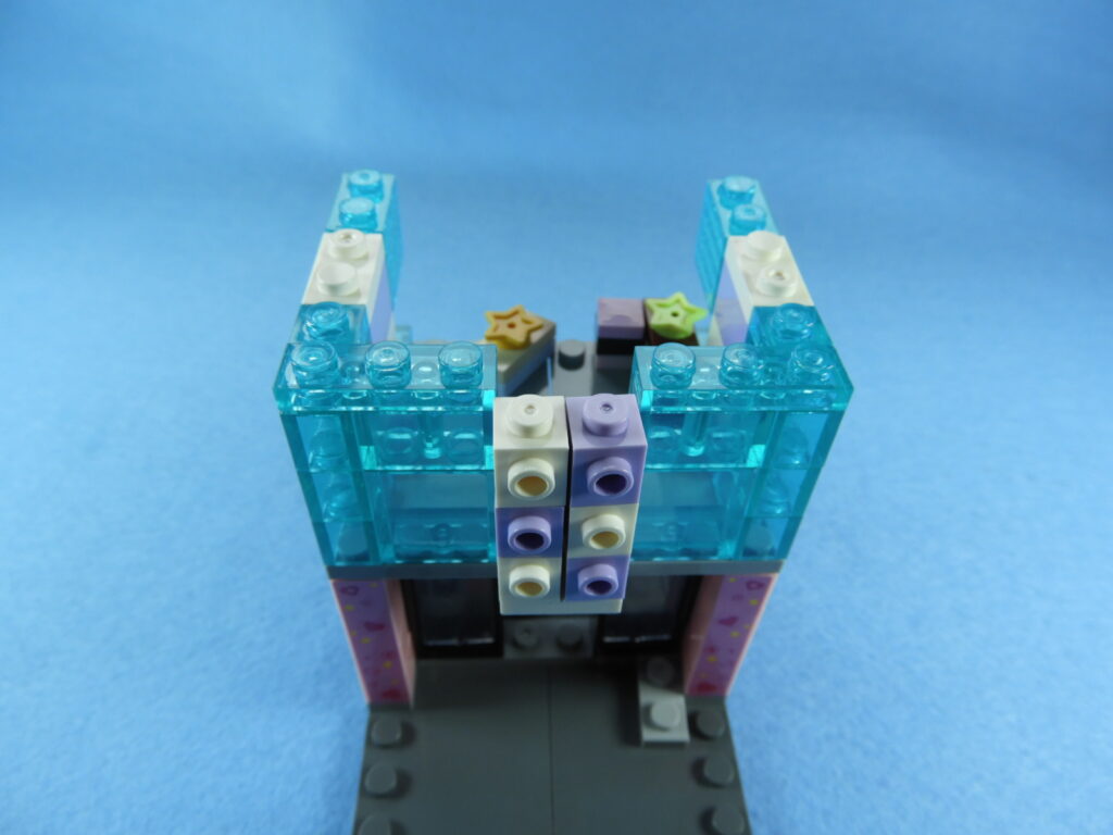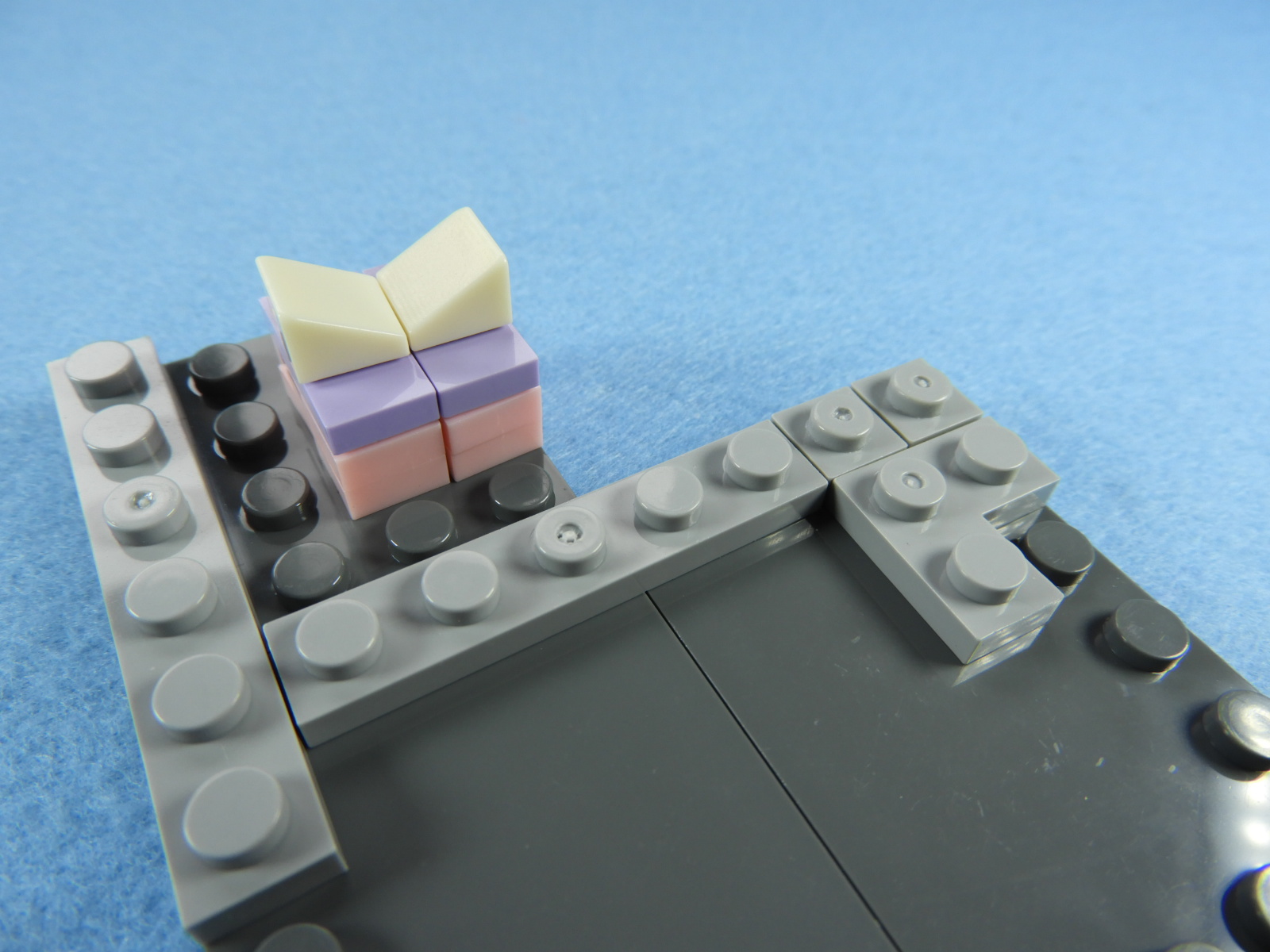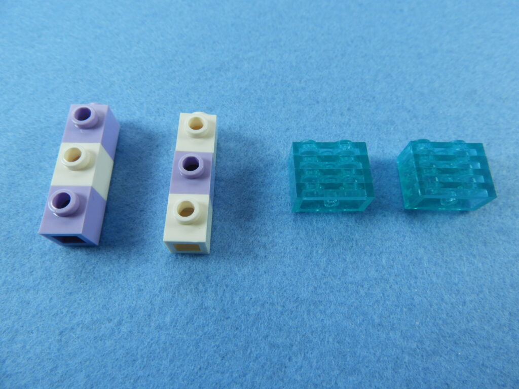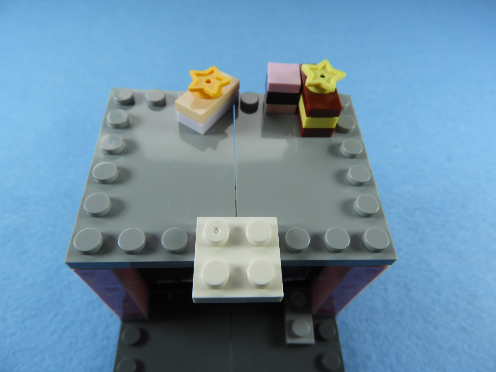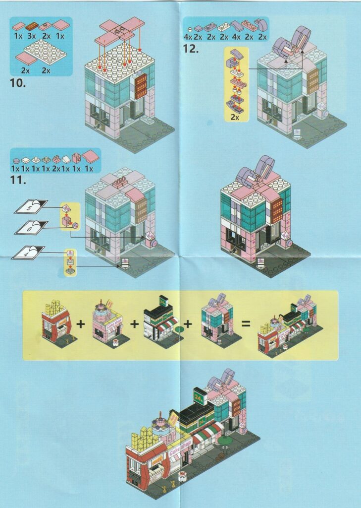 それでは工程12番で使用するブロックを並べます。1.用意したブロックを下記写真のように組み立てます2.下記白ブロックを紫ブロックに取り付けますが、直接取り付けるときにはまらないときは以下の方法で取り付けるとはまると思います。2.下記写真のように白ブロックを置いたら、1番で組み立てた紫ブロックを上から押し付けるとはまりやすいです。3.こんな感じに白ブロック4個を取り付けます。4.残りのブロックを下記写真のように取り付けていきます。5.上記で組み立てたブロックを建物の屋根に取り付けるとギフトハウスは完成します。作業お疲れ様でした♪