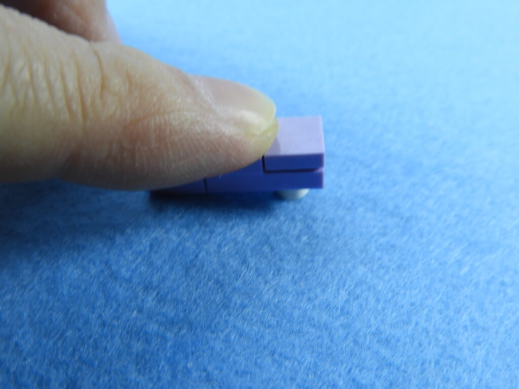 それでは工程5番で使用するブロックを並べます。1.用意した紫ブロック1個とピンクブロック6個を下記写真のようにのせます。2.残りの白ブロック4個をのせて、紫ブロックにNo.3のシールを貼り付けると工程5番は完成します。くぼみがある白ブロック2個は外側に向けて取り付けてくださいね。