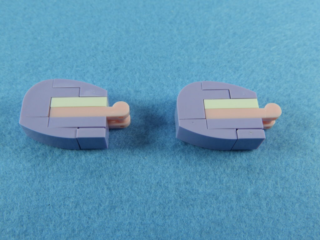 それでは工程6番で使用するブロックを並べます。用意したブロックを下記写真のように組み立てて、ピンクブロックにNo.1、2のシールを貼り付けると工程6番は完成します。