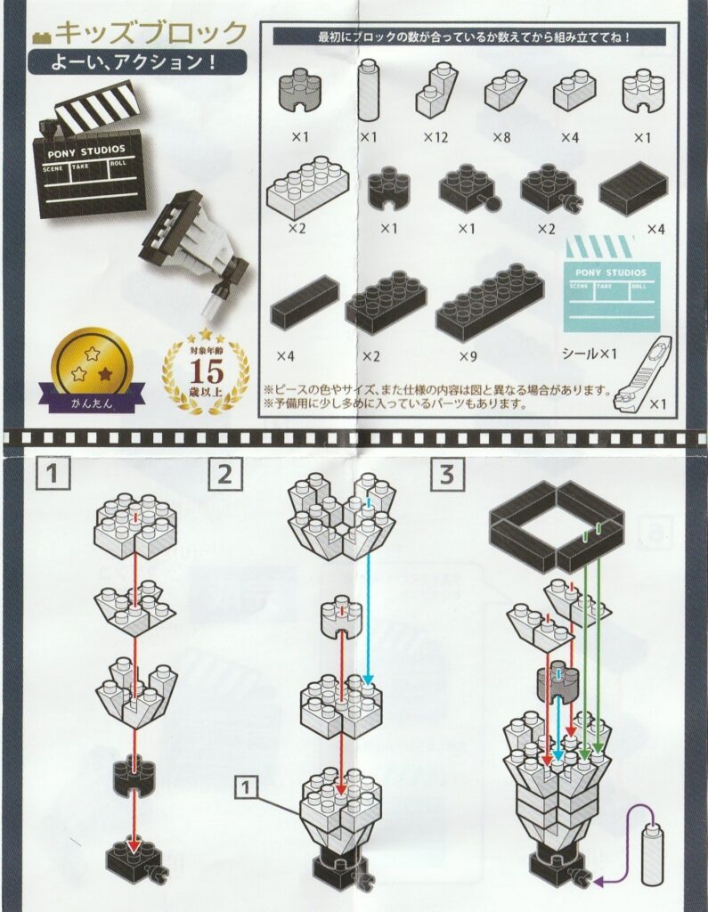 セリア★キッズブロック よーい、アクション!(シネマ)の作り方を解説していきます。取扱説明書ものせておきましたので確認しながら作ってくださいね♪