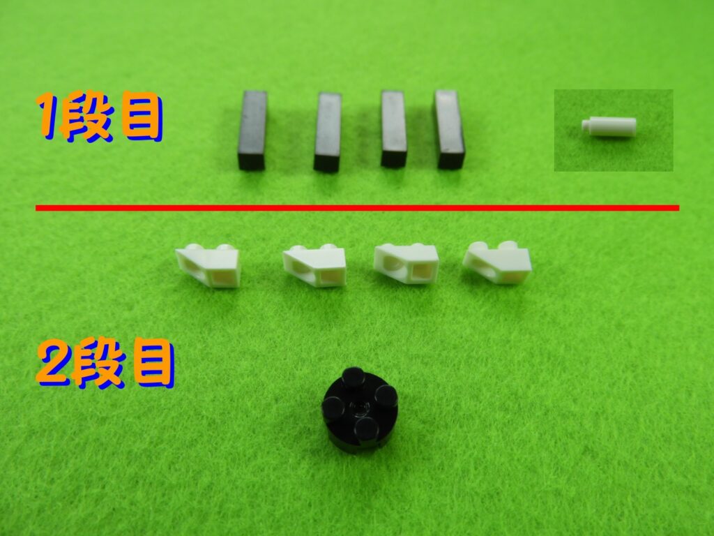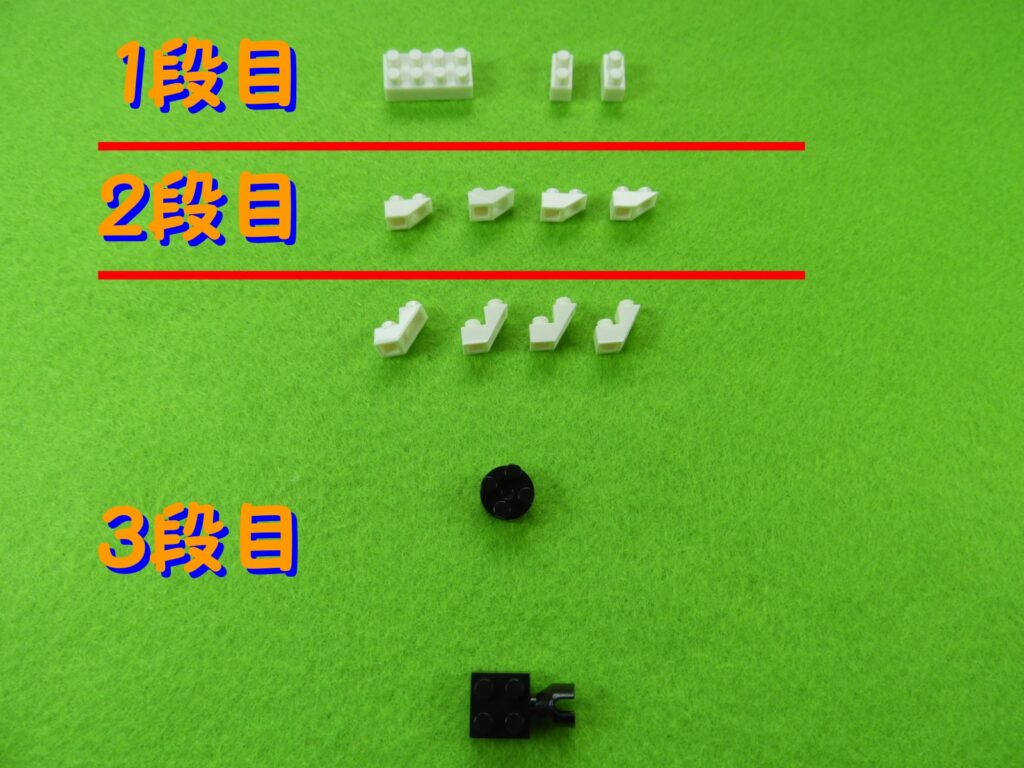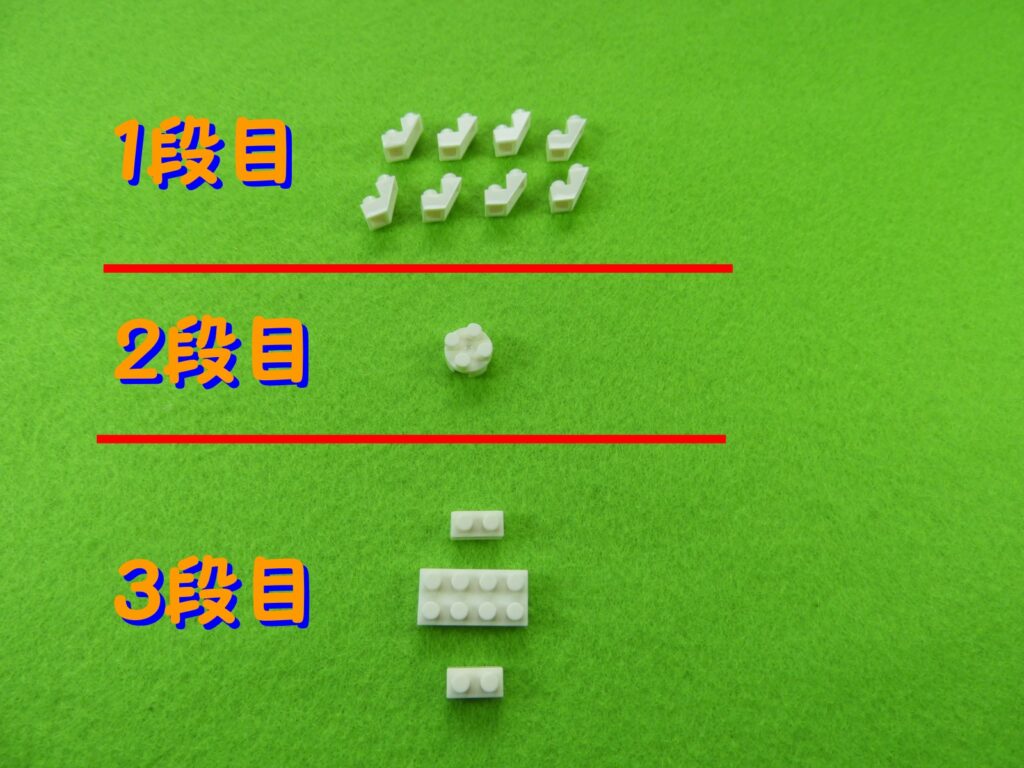 それでは工程1番で使用するブロックを並べます。1.3段目のブロックを順番に組み立てると下記写真のようになります。上からみるとこんな感じです。