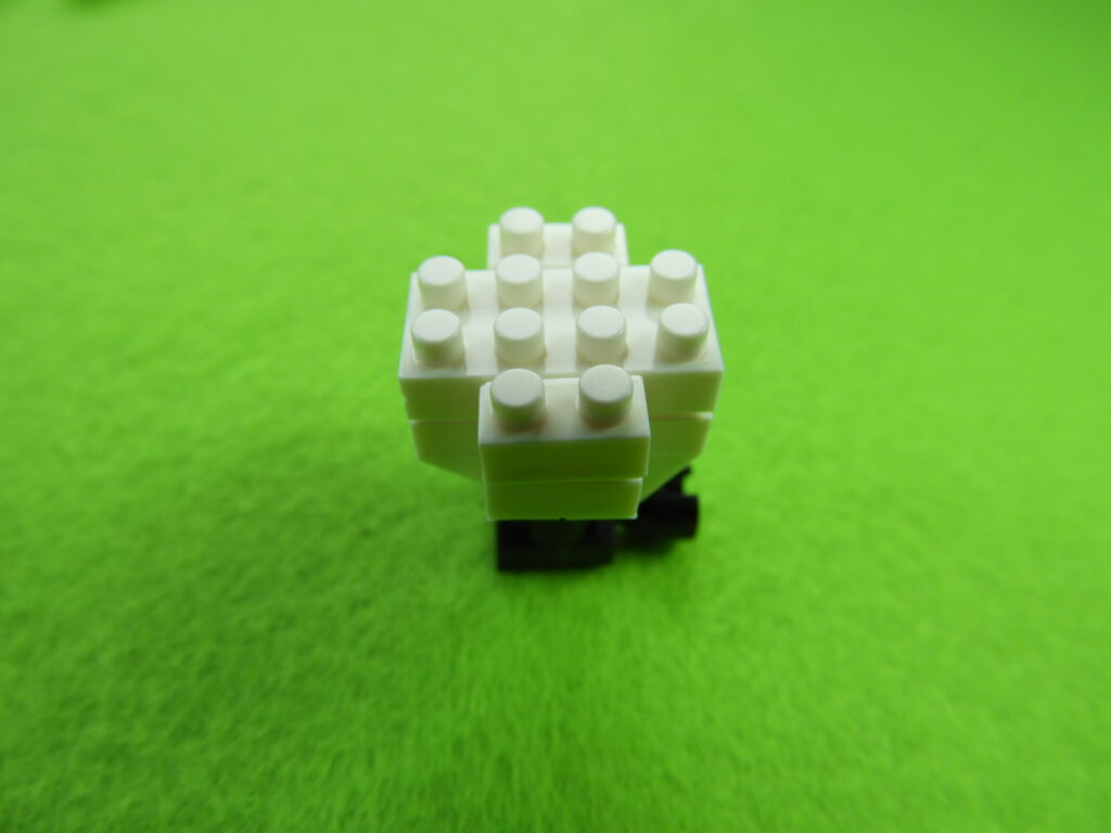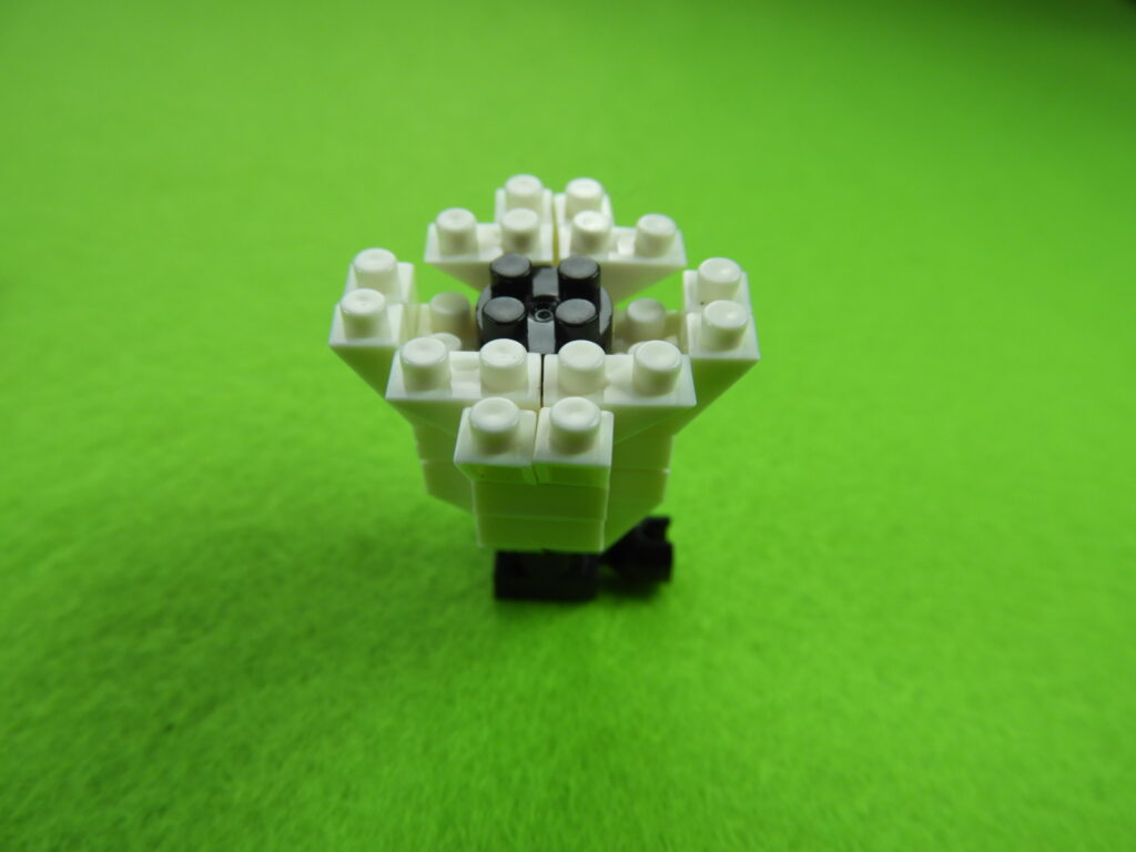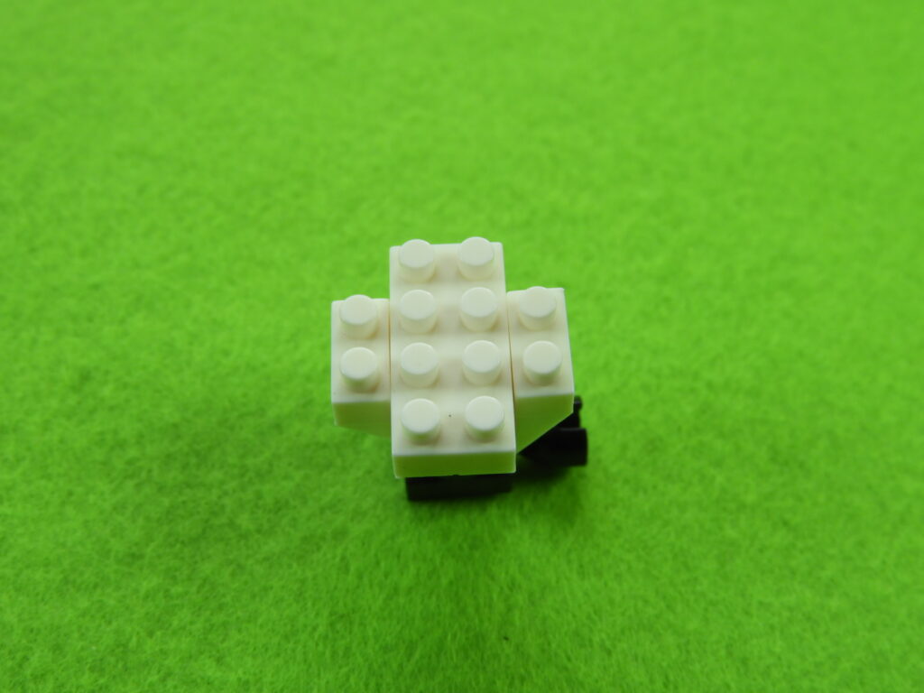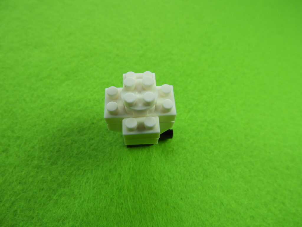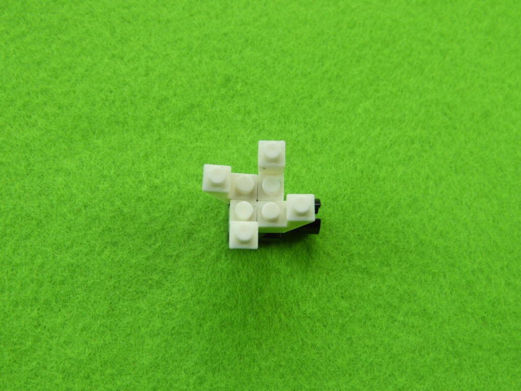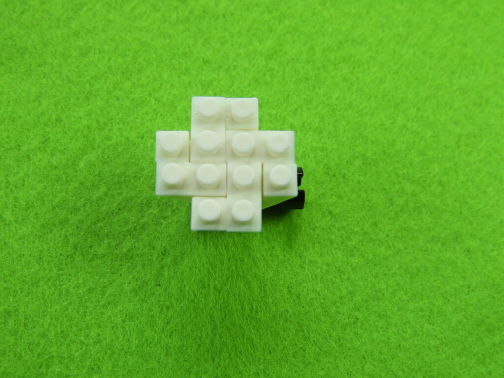 1.工程2番で組み立てたブロックの上に、2段目のブロック5個をのせます。2.上記で組み立てたブロックの上に、1段目の黒ブロック4個をのせて白ブロック1個を取り付けると工程3番は完成します。