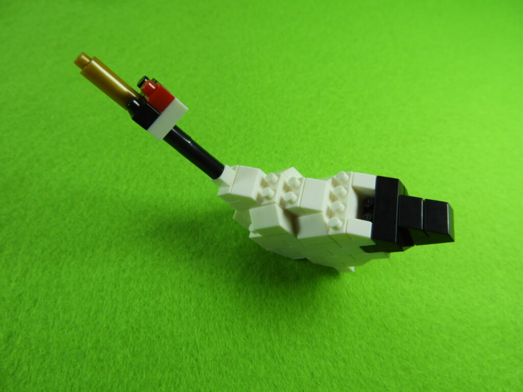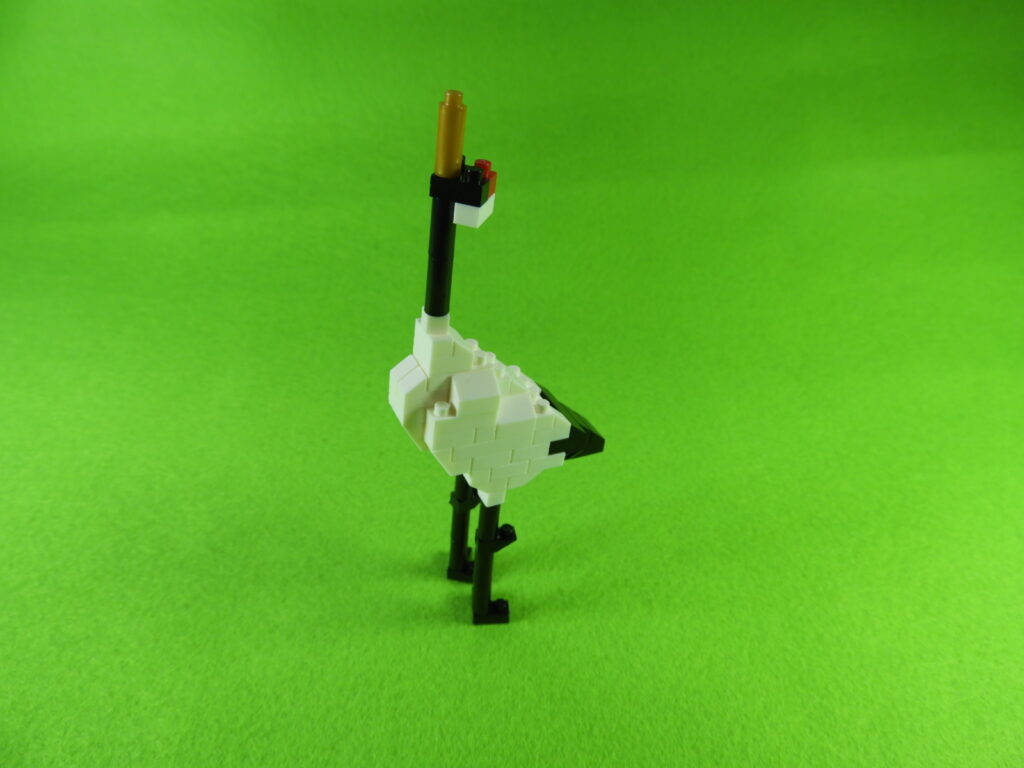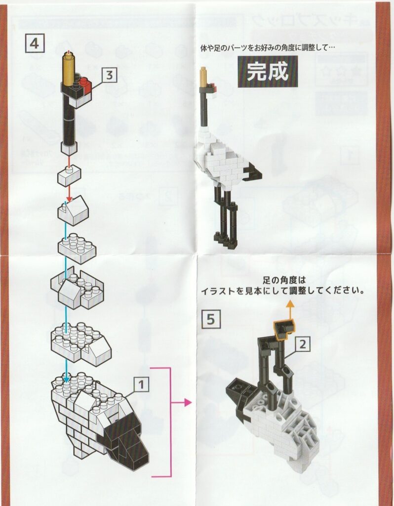 工程5番は上記で組み立てたブロックに、工程2番で組み立てたタンチョウの脚を取り付けるとタンチョウが完成します。作業お疲れ様でした♪