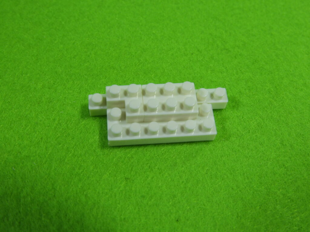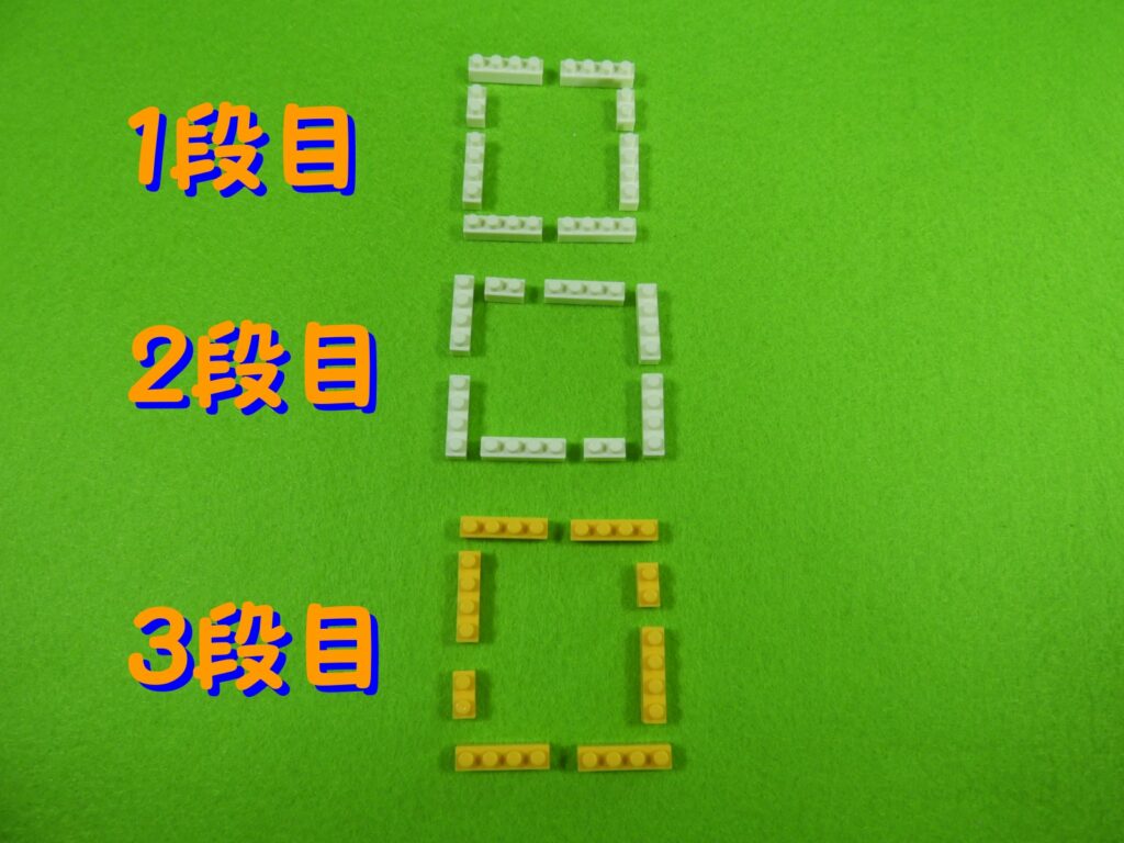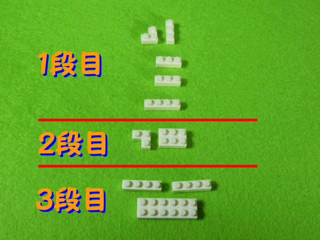それでは工程1番で使用するブロックを並べます。1.3段目のブロックの上に、2段目のブロックをのせます。2.上記で組み立てたブロックの上に、1段目のブロックをのせると工程1番は完成します。