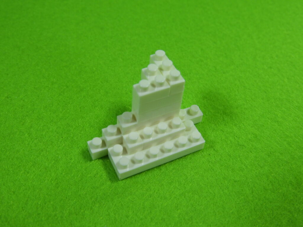 それでは工程2番で使用するブロックを並べます。1.工程1番で組み立てたブロックの上に、3段目のブロックをのせます。2.上記で組み立てたブロックの上に、2段目のブロックをのせます。3.上記で組み立てたブロックの上に、1段目のブロックをのせると工程2番は完成します。