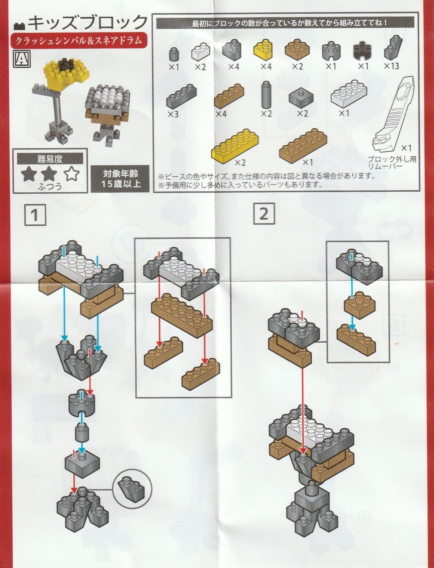 セリア★キッズブロック ドラムセット・Aクラッシュシンバル&スネアドラムの作り方を解説していきます。取扱説明書ものせておきましたので確認しながら作ってくださいね♪