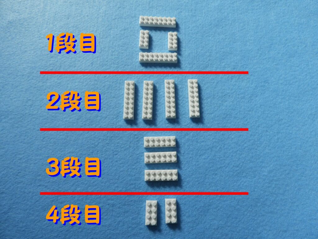 それでは工程3番で使用するブロックを並べます。1.4段目のブロック2個の上に、3段目のブロック2個をのせます。2.上記で組み立てたブロックの上に、2段目のブロック2個をのせます。3.上記で組み立てたブロックの上に、1段目のブロック3個をのせます。4.上記で組み立てたブロックを工程2番で組み立てたブロックに取り付けると工程3番は完成します。