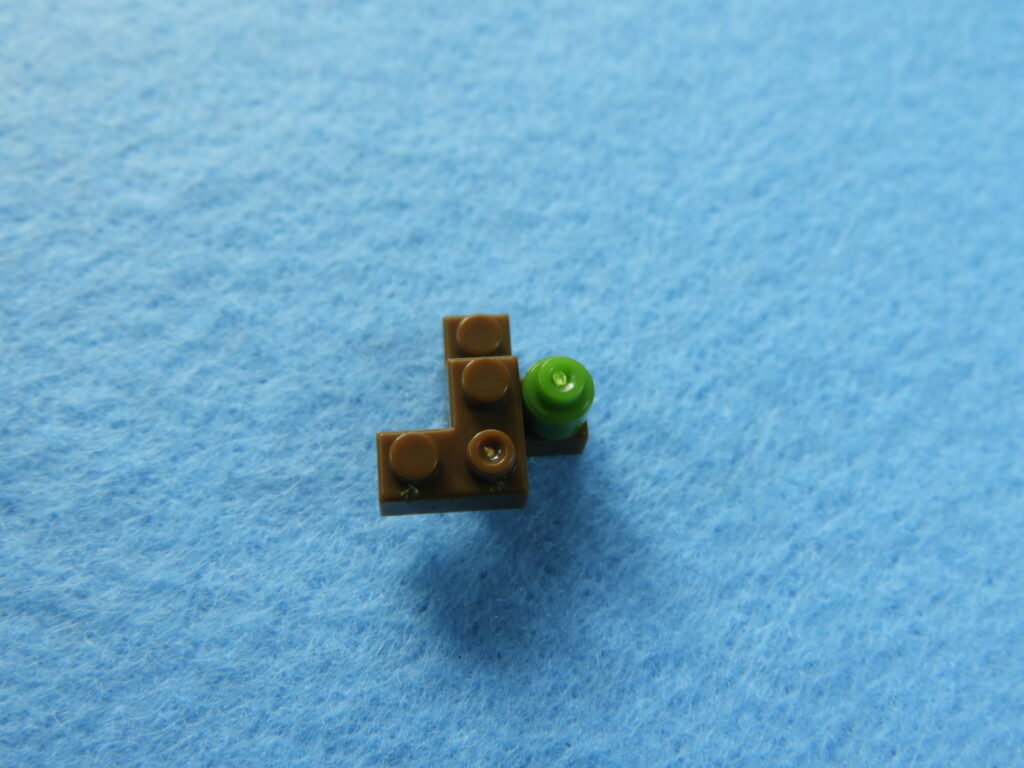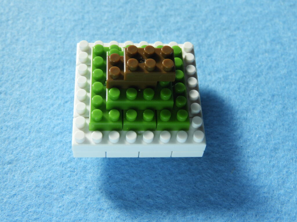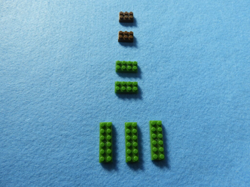 それでは工程2番で使用するブロックを並べます。1.緑ブロック5個を工程1番で組み立てたブロックの上に、下記写真のようにのせます。2.上記で組み立てたブロックの上に、残りの茶色ブロック2個をのせると工程2番は完成します。