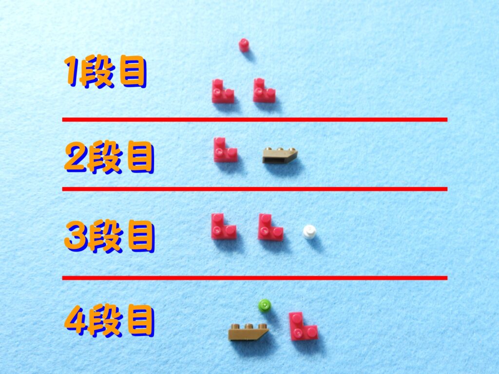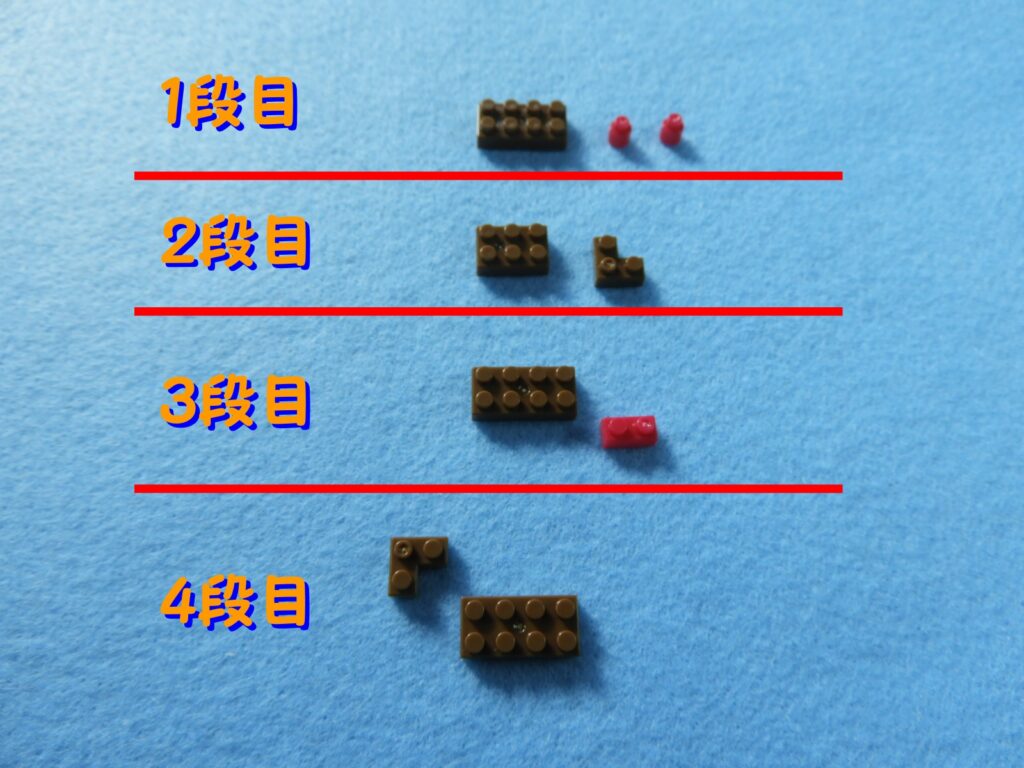 それでは工程4番で使用するブロックを並べます。1.赤枠で囲っているブロック3個を下記写真のように組み立てます。2.上記で組み立てたブロックの上に、残りの白・赤ブロックをのせます。3.上記で組み立てたブロックを下記写真のように取り付けるとOKです。4.次は左側5段目の茶ブロックの上に、4段目のブロック2個をのせます。5.上記で組み立てたブロックの上に、3段目のブロック2個をのせます。6.上記で組み立てたブロックの上に、2段目のブロック3個をのせます。