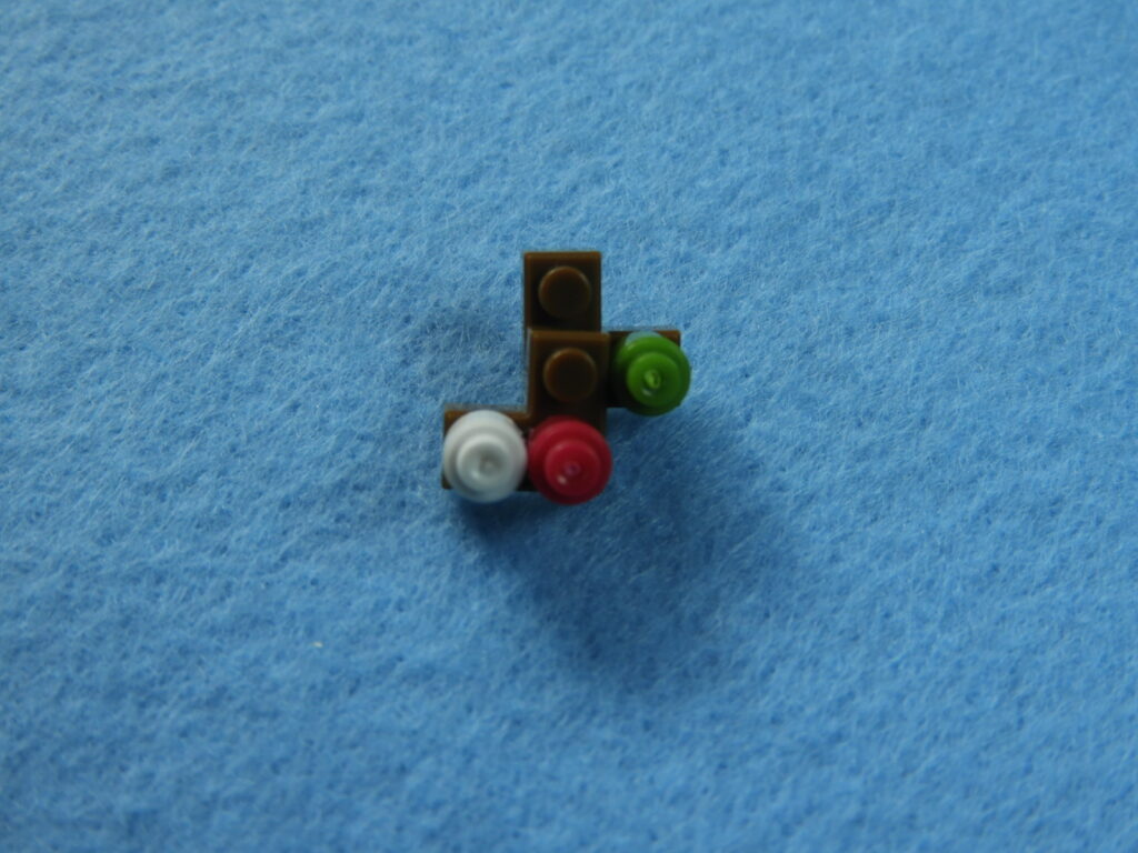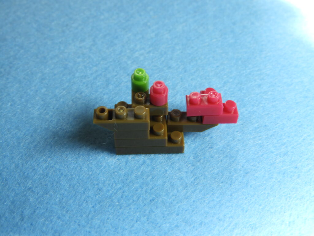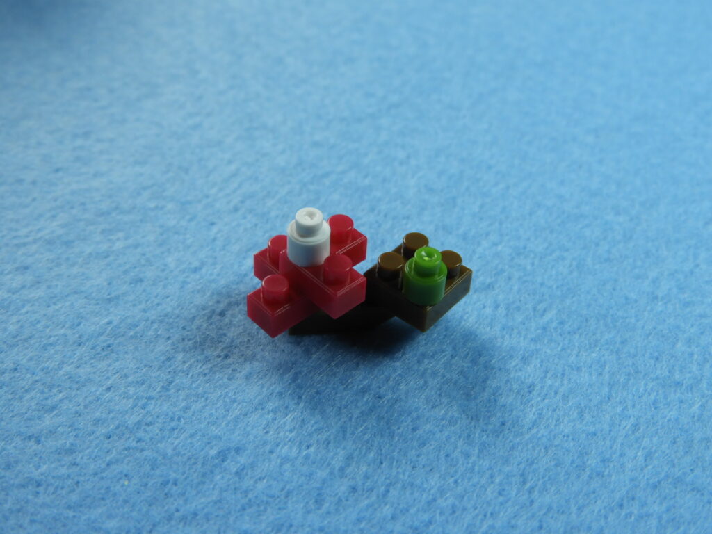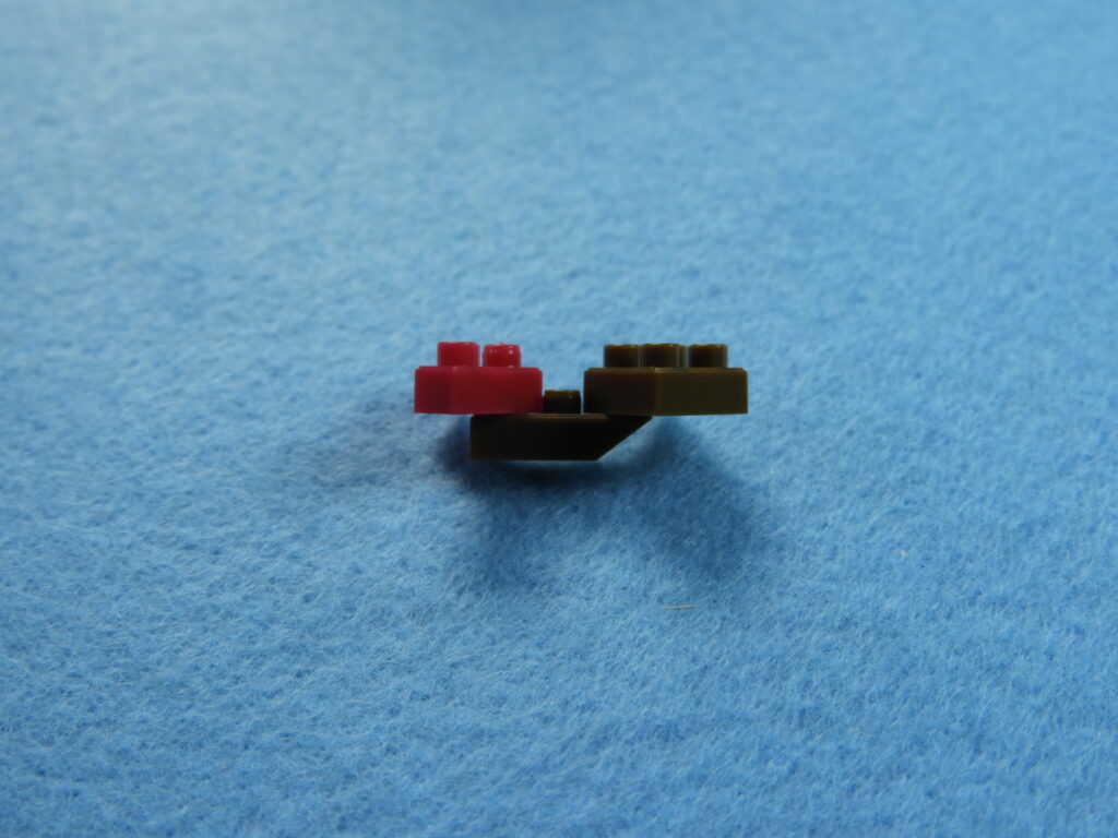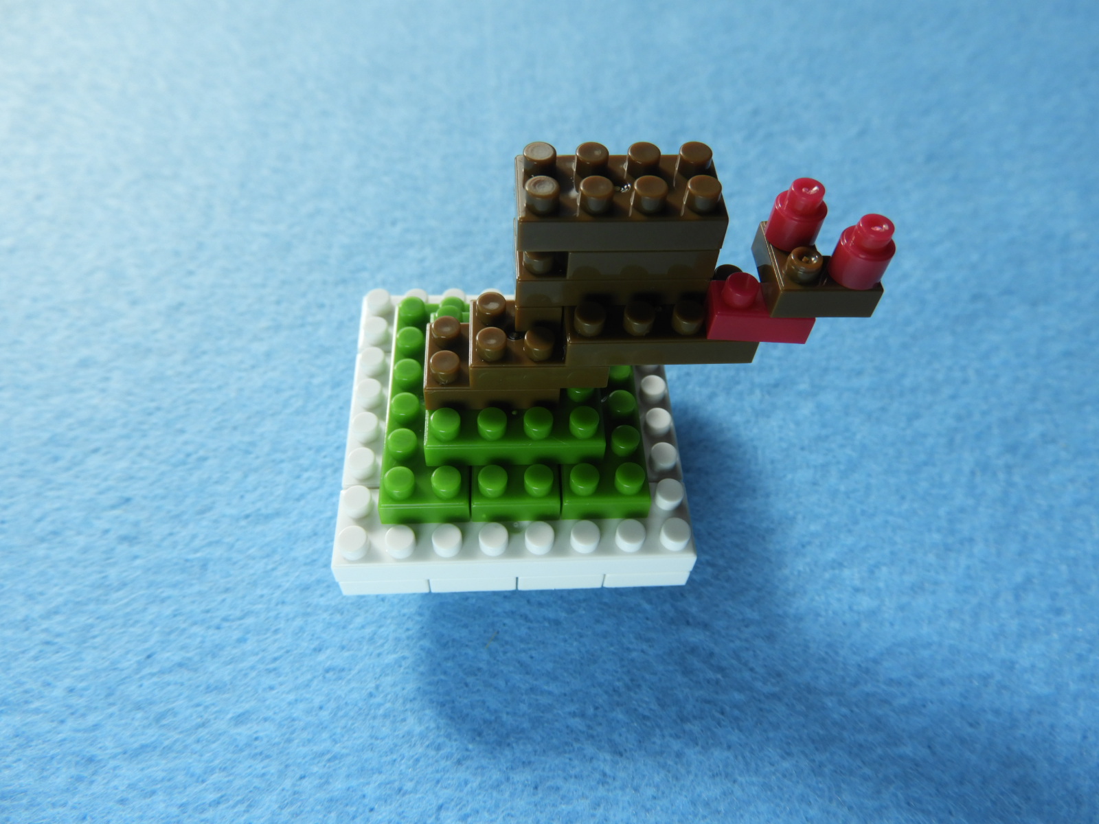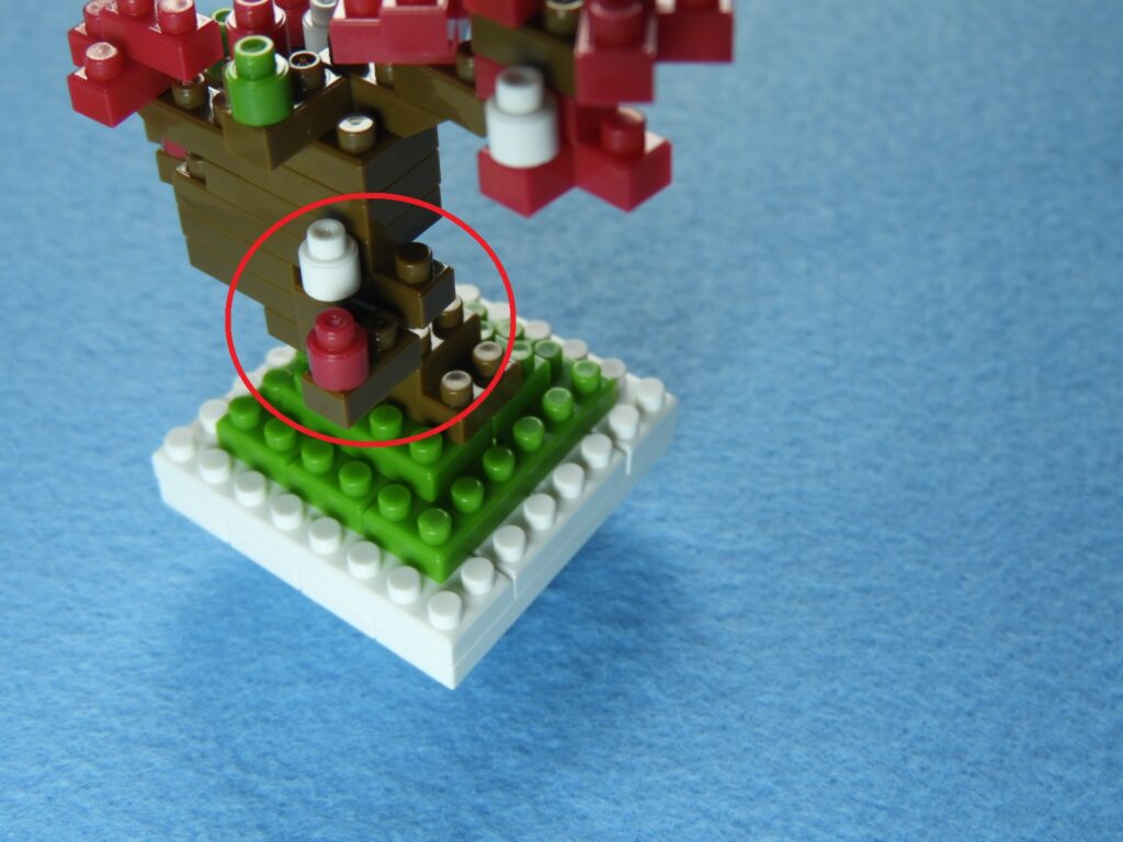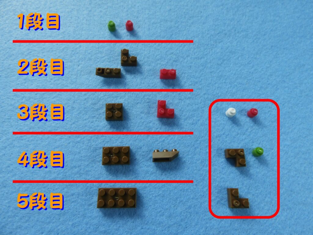 それでは工程5番で使用するブロックを並べます。1.4段目の茶・赤ブロック2個の上に、3段目のL字ブロック1個をのせます。2.3段目・4段目の残りのブロックを下記写真のように取り付けます。3.上記で組み立てたブロックの上に、2段目のブロック2個をのせます。4.上記で組み立てたブロックの上に、1段目のブロック3個をのせます。5.上記で組み立てたブロックを工程4番で組み立てた枝の上にのせると工程5番は完成します。