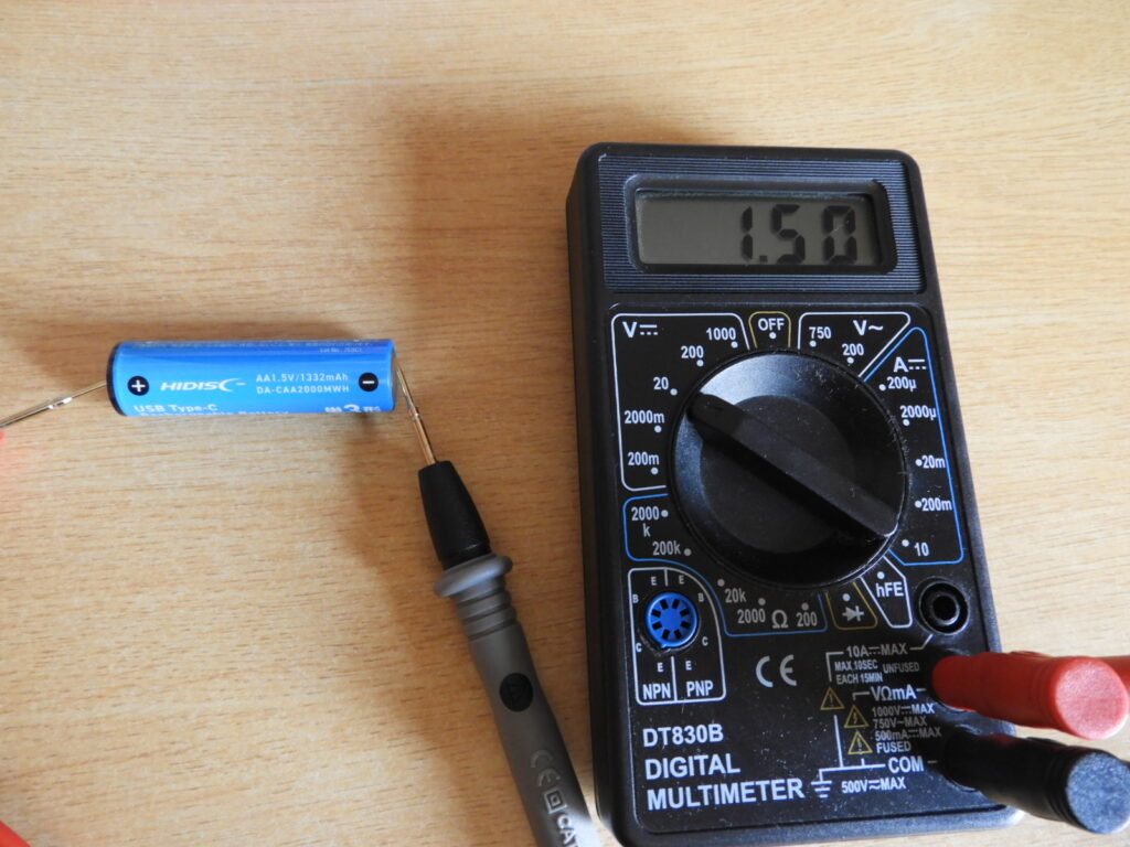充電完了後に電圧を測定してみると、しっかり1.5V出ていました。ニッケル充電池(1.2V)と違いリチウム充電池は、1.5V出ているのでありがたいです。