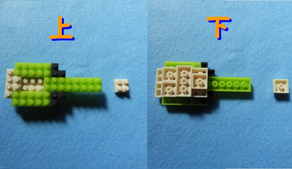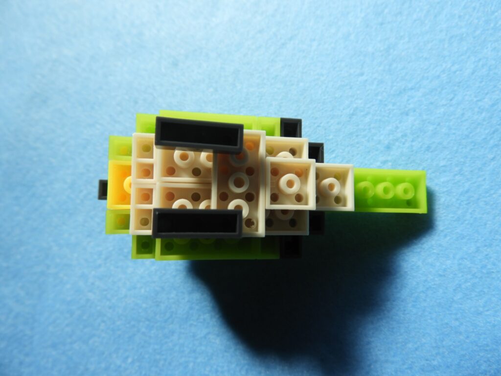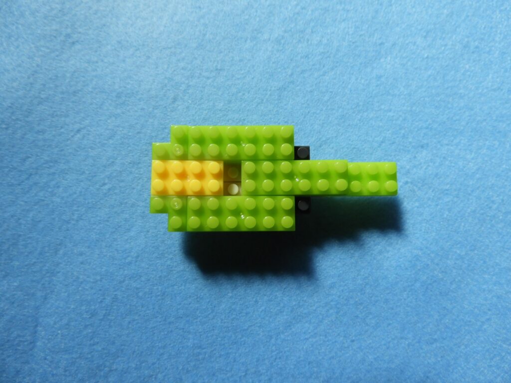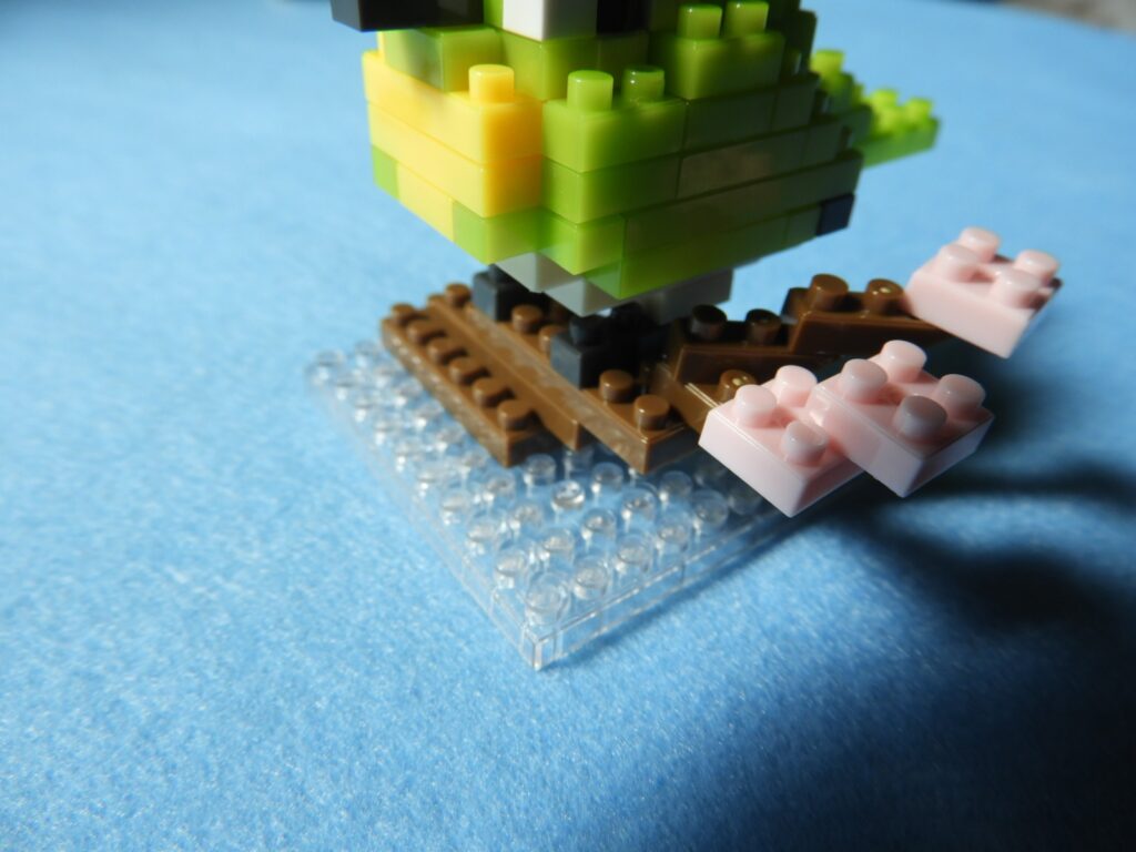 1.組み立てたメジロを裏返しにして、黒ブロック2個を取り付けます。足部分はこんな感じになりますよ。