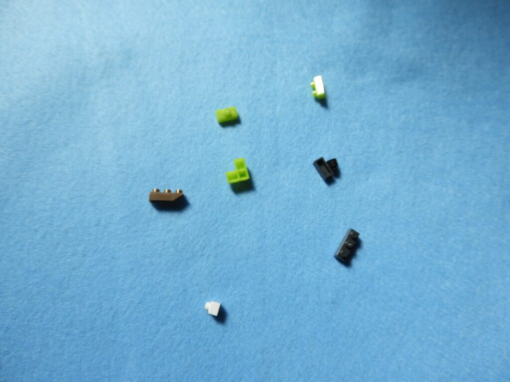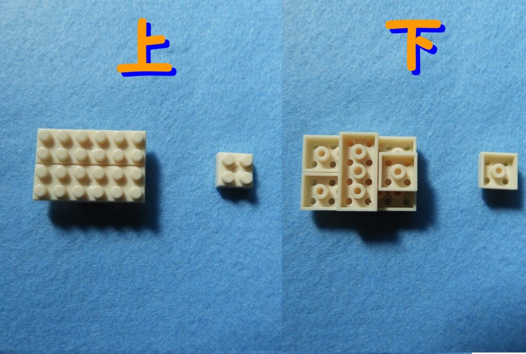 組み立てる前に、工程1番で使用するブロックを並べます。1.3段目のブロックを4段目のブロックの上にのせます。右の正方形ブロックは、まだバラけています。下記写真、左側は上から、右側は下から見たブロックになります。