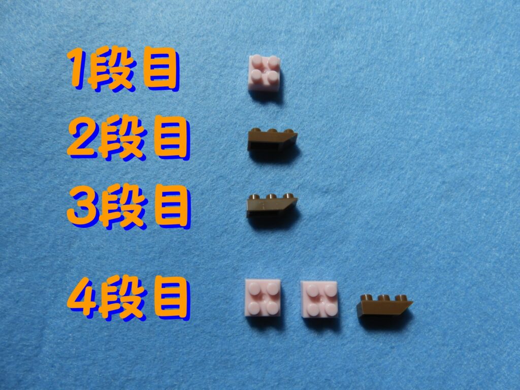 1.4段目の茶色ブロックの上に、4段目の正方形ピンクブロックをのせます。ピンクブロックがのっている茶色ブロックの下は斜めになっています。